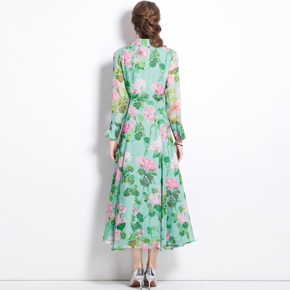 Pinkoz ターンダウン襟長袖シングルブレストマキシドレスホリデーファッショングリーン花柄ロングパーティーボヘミアンドレス ピンク