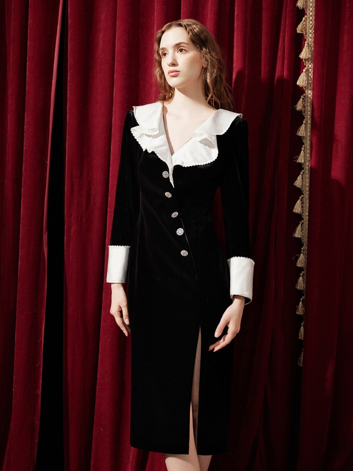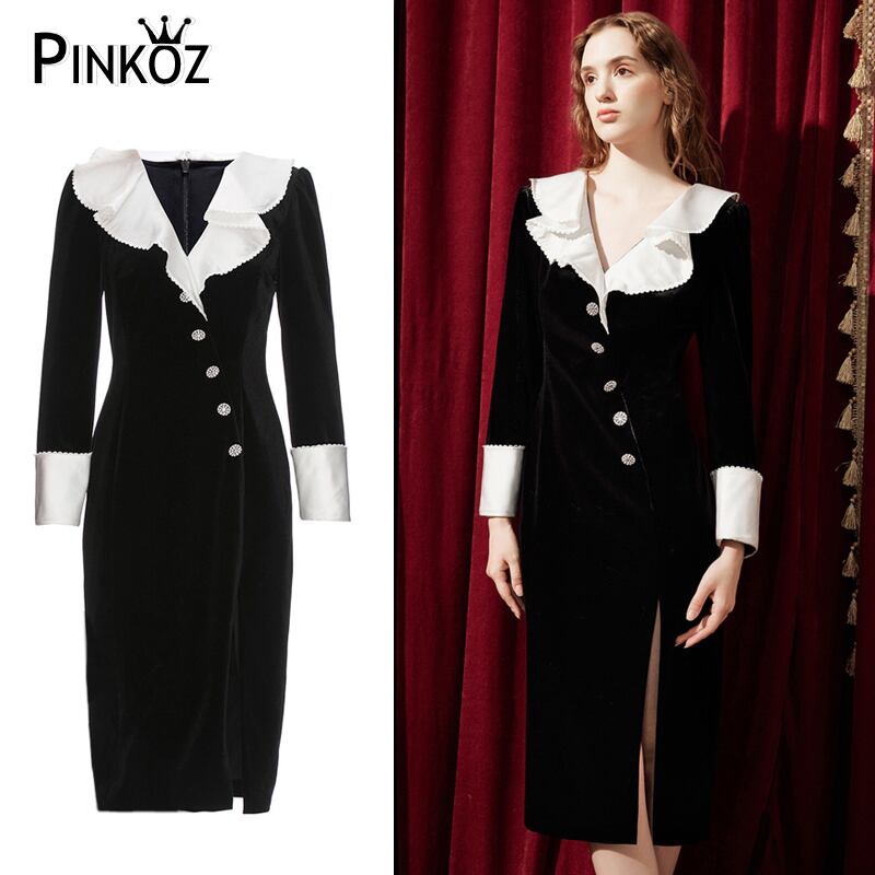 Pinkoz ヴィンテージ Vestidos 黒鉛筆ミディドレスパッチワークピーターパン襟ボタンデザイナー新しいファッション自由奔放生きるエレガント作業ローブ ピンク ブラック ビンテージ