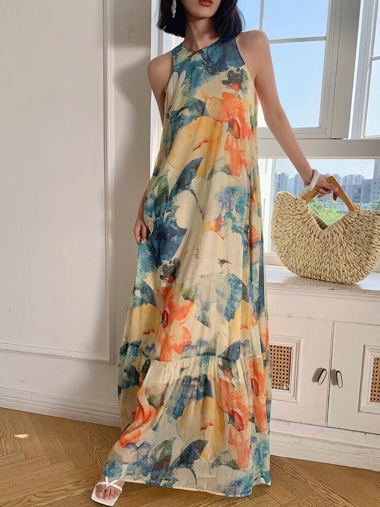 Pinkoz 夏夜絵画パターンプリント O ネックルーズ A ラインミディドレスドレスレースアップヴィンテージナイト Vestidos za ピンク サマー 夏物 Oネック Aライン ビンテージ
