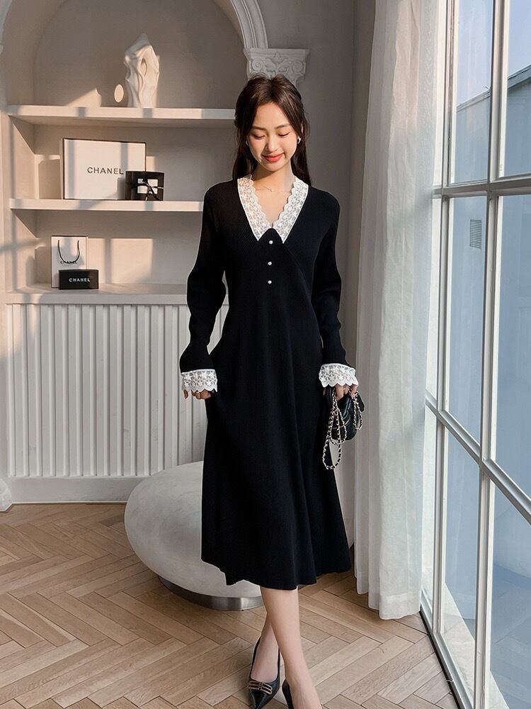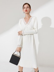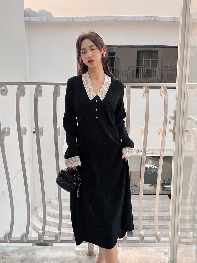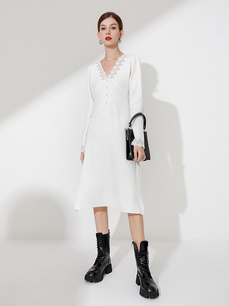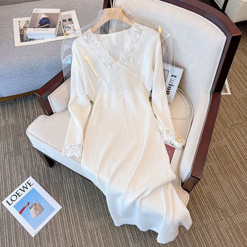 Pinkoz ホワイトパッチワークレースニット A ラインフレアスリーブミディドレスエレガントファッションナイトボタンロングドレス Vestidos ヴィンテージ ピンク Aライン ビンテージ