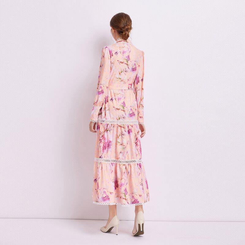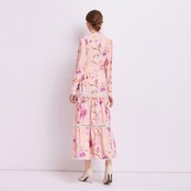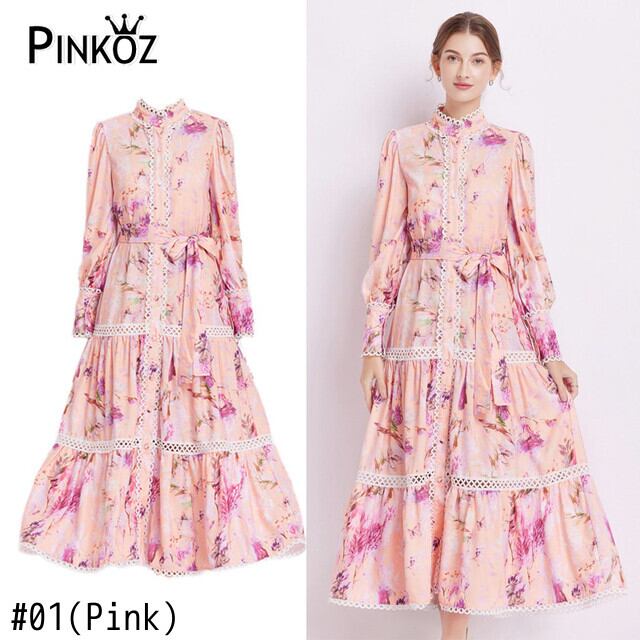 Pinkoz 滑走路デザイナースタイリッシュピンク花柄マキシパッチワーク中空アウトスタンドカラー長袖ベストパーティーナイトローブ ロング