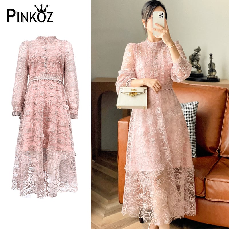 Pinkoz 新しいファッションデザインスタイリッシュミディピンクパッチワークメッシュドレス花柄春秋 A ラインパーティーエレガントドレス traf スプリング 春物 オータム 秋物 Aライン