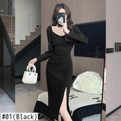 Pinkoz フレンチシックパープルペンシルミディドレススクエアカラー長袖エレガントオフィスレディハイウエストファッションドレスカジュアル ハイウェスト ロング ピンク スクウェア 会社 学校 通勤や通学にも