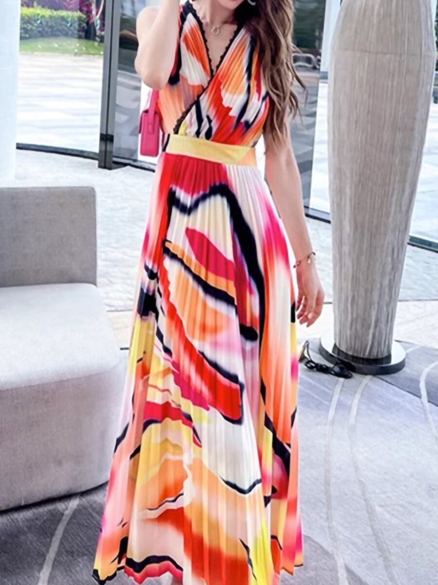 Pinkoz 滑走路デザイナー v ネックタンクノースリーブカラフルストライププリーツマキシドレスパーティーディナーパッチワークプリーツベスト ピンク Vネック