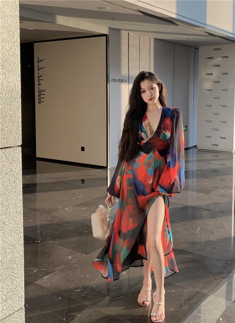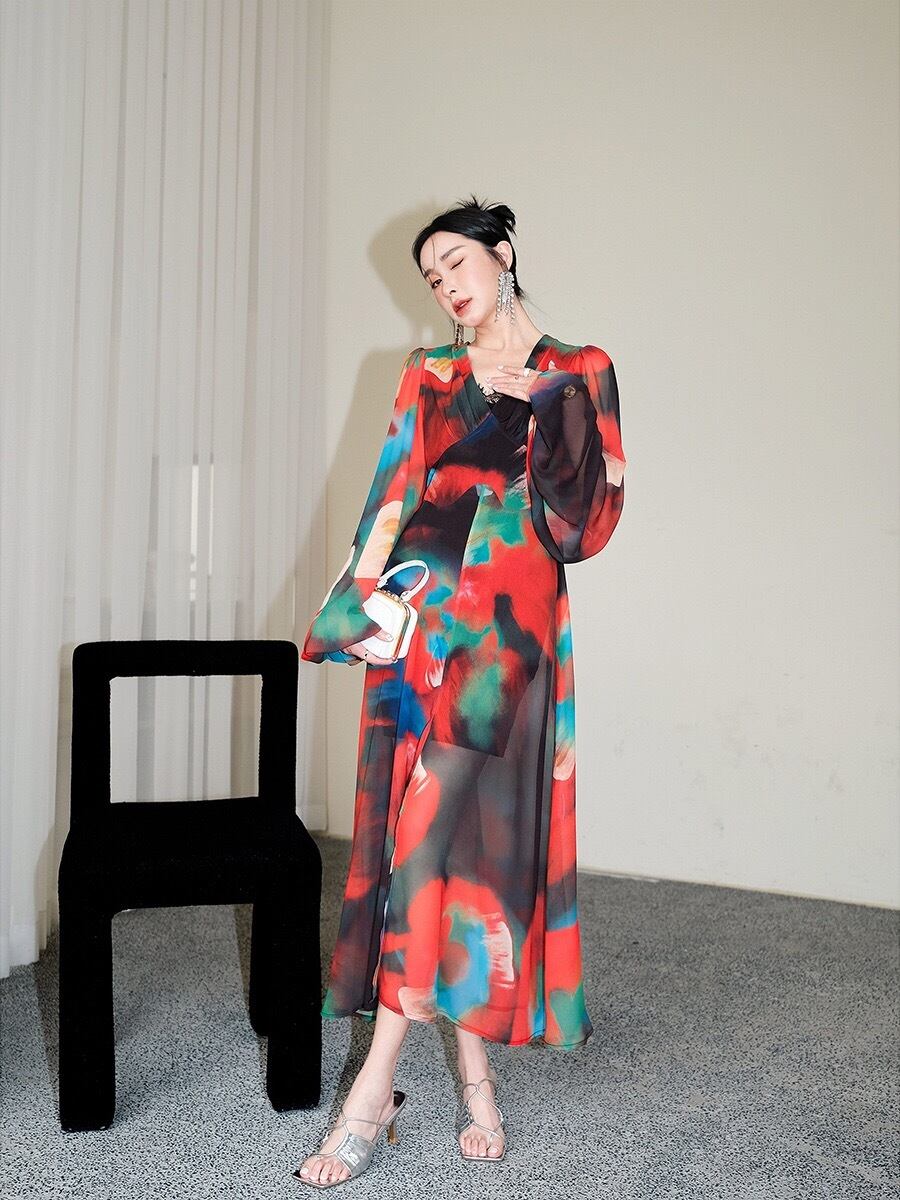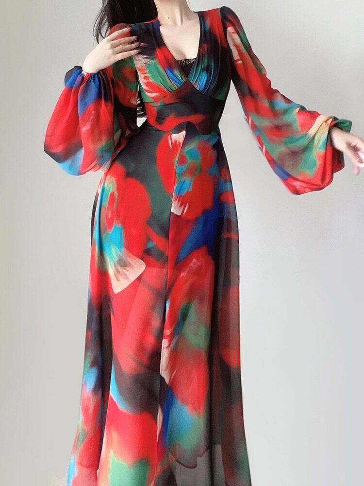 Pinkoz デザイナー春夏花柄シフォンマキシロングドレスホリデーシック A ライン自由奔放生きるローブ · デ · mujer vestidos y2k ピンク スプリング 春物 サマー 夏物 Aライン
