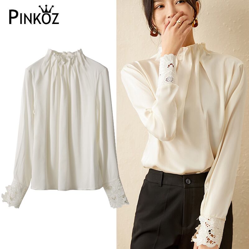 Pinkoz ベージュスタンドカラーエレガントブラウスパッチワークレース中空アウトオフィスレディルーズサイズファッション衣類ヴィンテージトップス ピンク ビンテージ 会社 学校 通勤や通学にも
