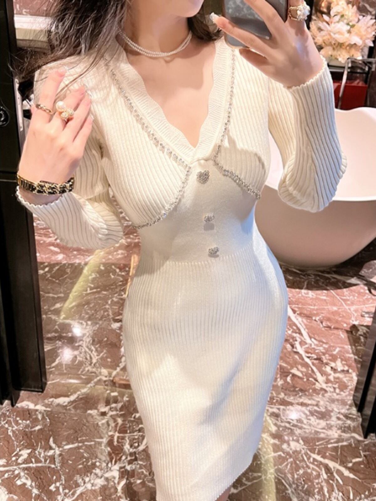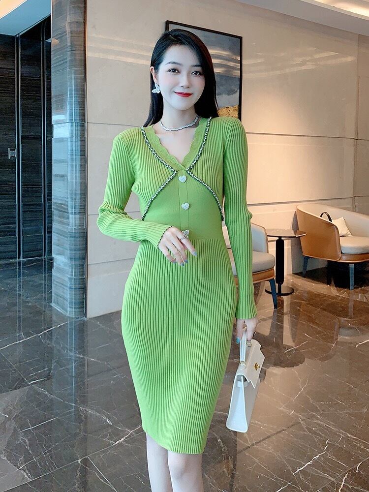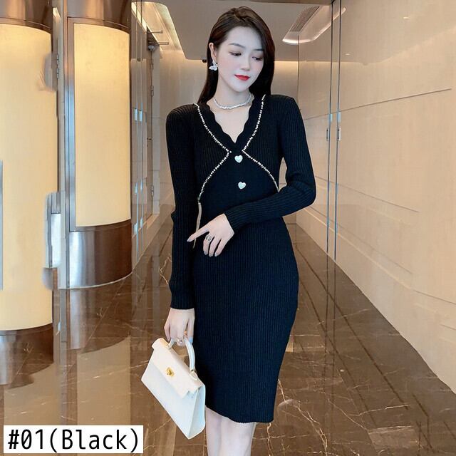 Pinkoz エレガント春秋ニットミディドレスシースぬるぬる v ネック長袖クリスタルハート愛ボタンドレスローブ ロング ピンク スプリング 春物 オータム 秋物 Vネック
