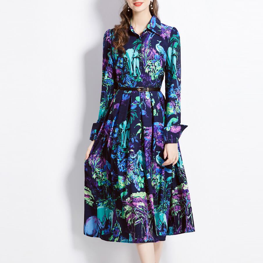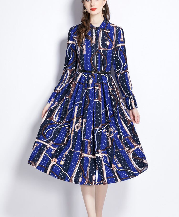Pinkoz ブルーチェーンパターンターンダウン襟ファッションセレブミディドレスシングルブレストエレガントローブとベルト za ピンク ハーネス