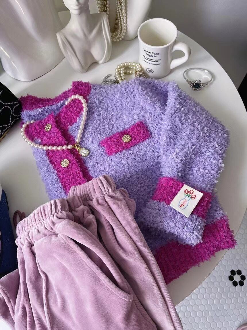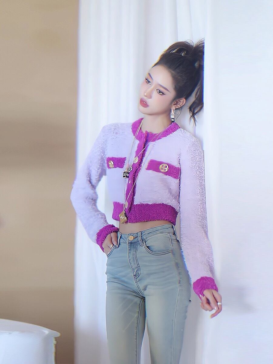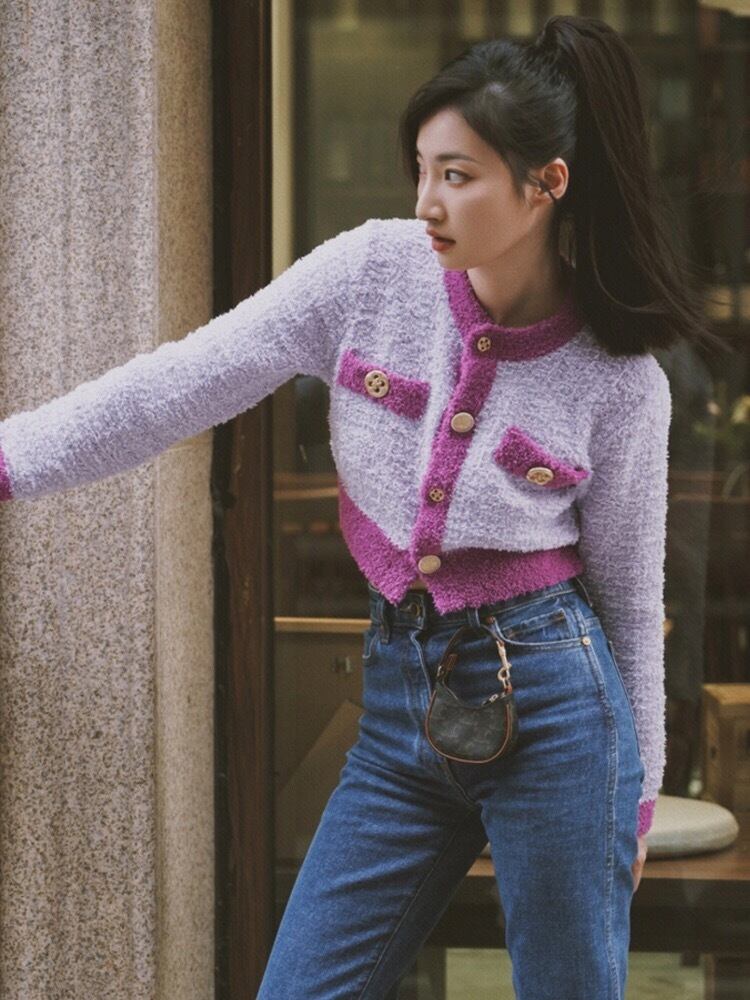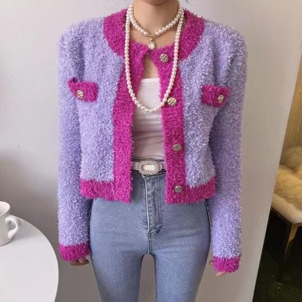 Pinkoz デザイナースタイリッシュパープルシングルブレスト O ネックエレガントファッションスタイルショートカーディガンニットトップスヴィンテージ ピンク Oネック ビンテージ