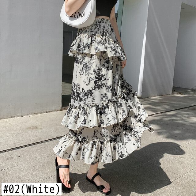 Pinkoz デザイナー黒花柄ハイウエストフリルマキシロングスカート分割カスケードレイヤードスカートカジュアルストリート traf ハイウェスト ピンク レッド ブラック ラッフル