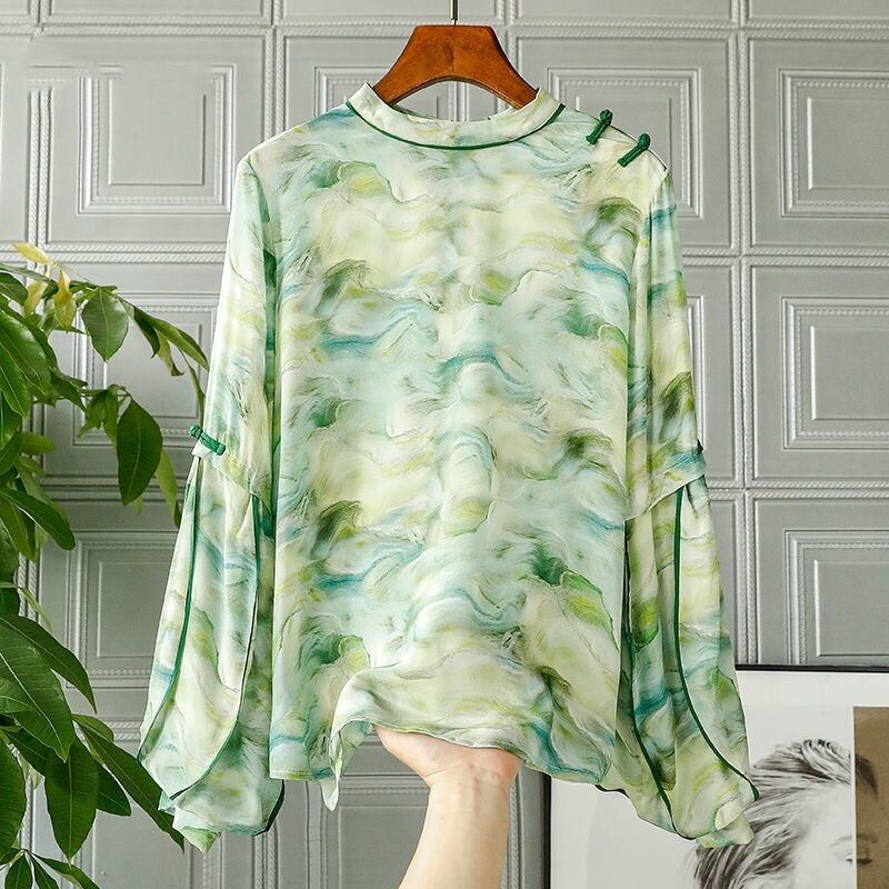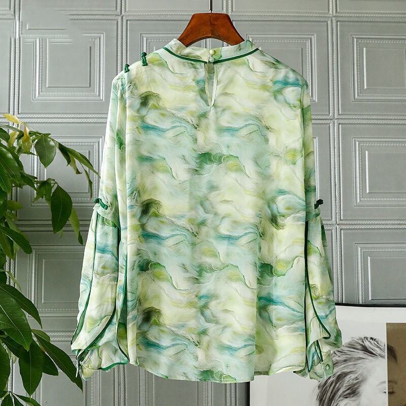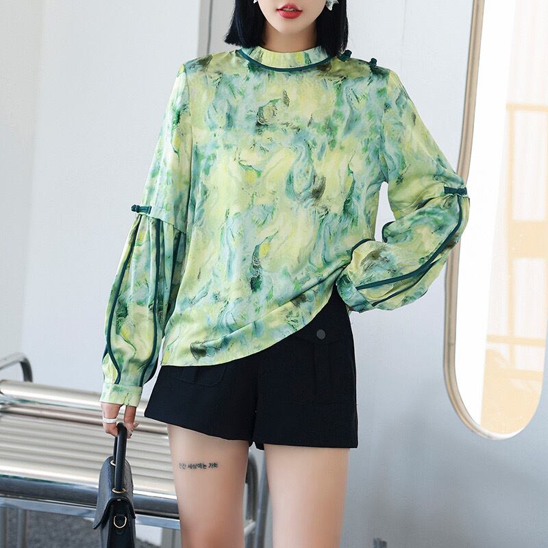 Pinkoz 春夏グリーン花柄ランタンスリーブルーズブラウスボタンパッチワークファッションシックホリデーシャツトップス ピンク スプリング 春物 サマー 夏物