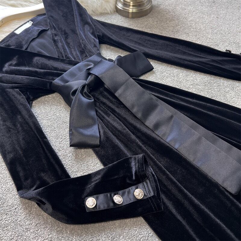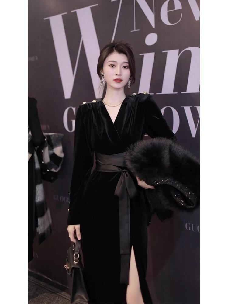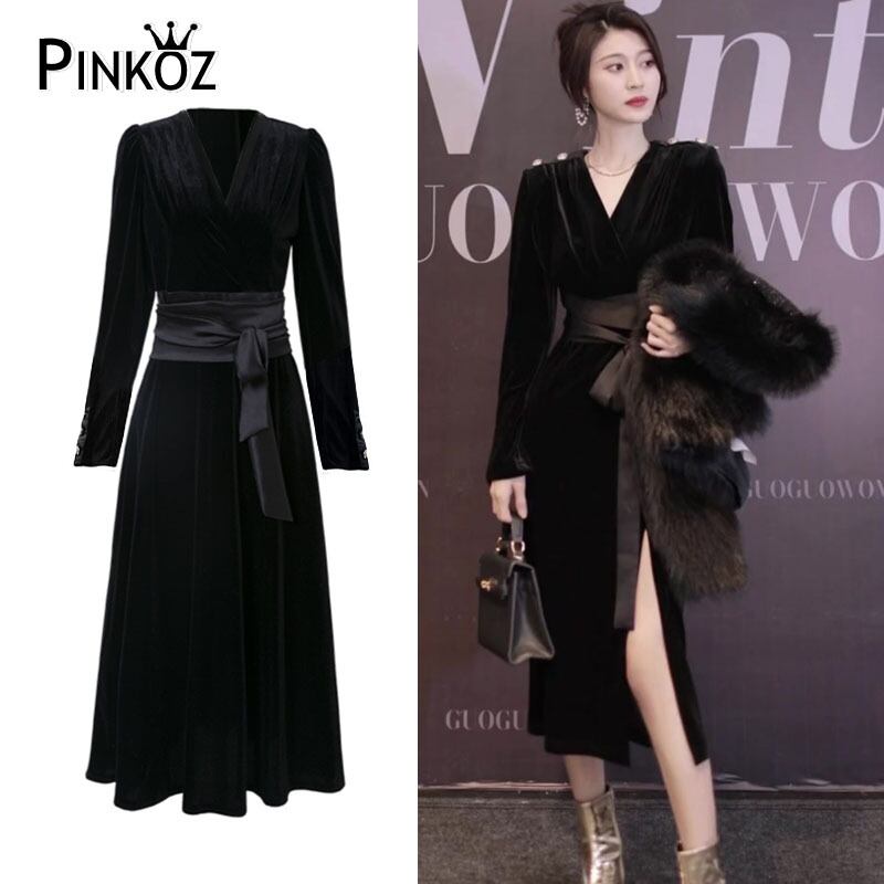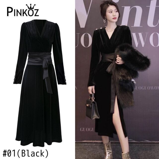 Pinkoz エレガントブラックベルベットミディドレス V ネック長袖パッチワークオフィスレディスプリット A ラインドレスベルトレースアップ ロング ピンク ハーネス Vネック Aライン 会社 学校 通勤や通学にも