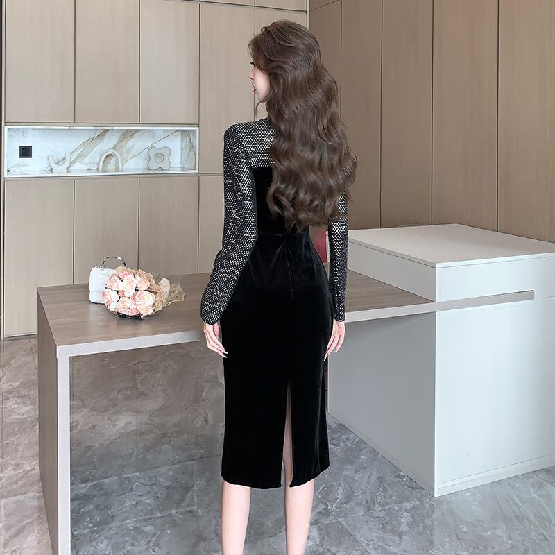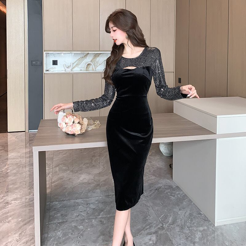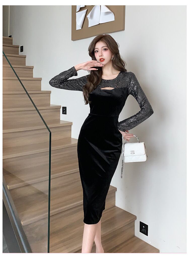 Pinkoz 黒パッチワークスパンコール中空アウトぬるぬるベルベットミディロングドレス秋冬ナイトvestidosヴィンテージ ピンク ブラック オータム 秋物 ウィンター 冬物 ビンテージ