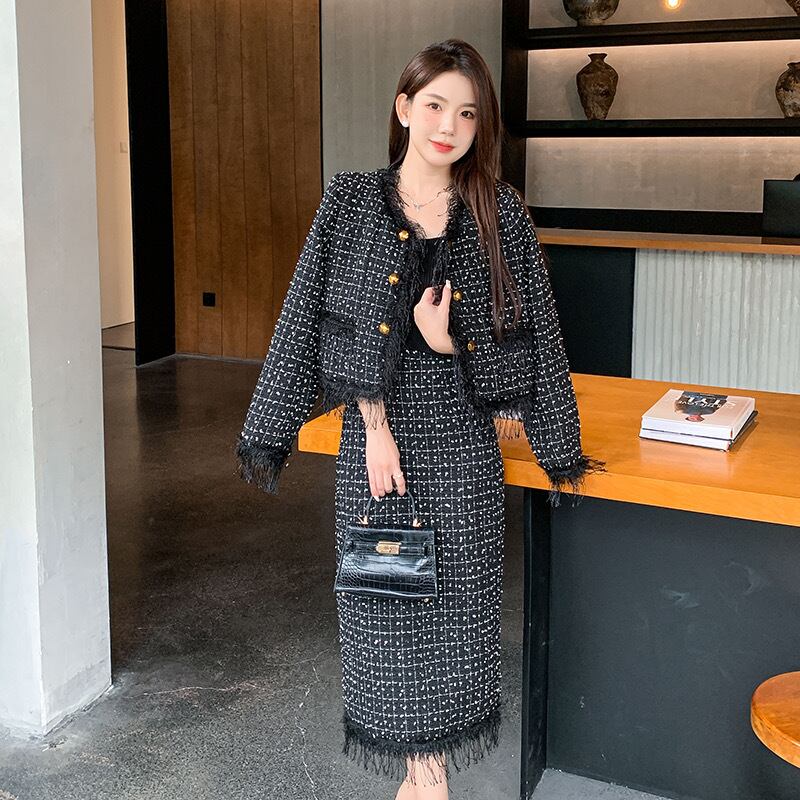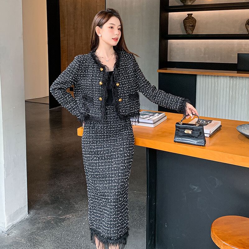 Pinkoz 2 枚セット黒ダブルブレストツイードジャケット電話ポケットオーバーコートミディロングペンシルスカートエレガント衣装 za ピンク ブラック