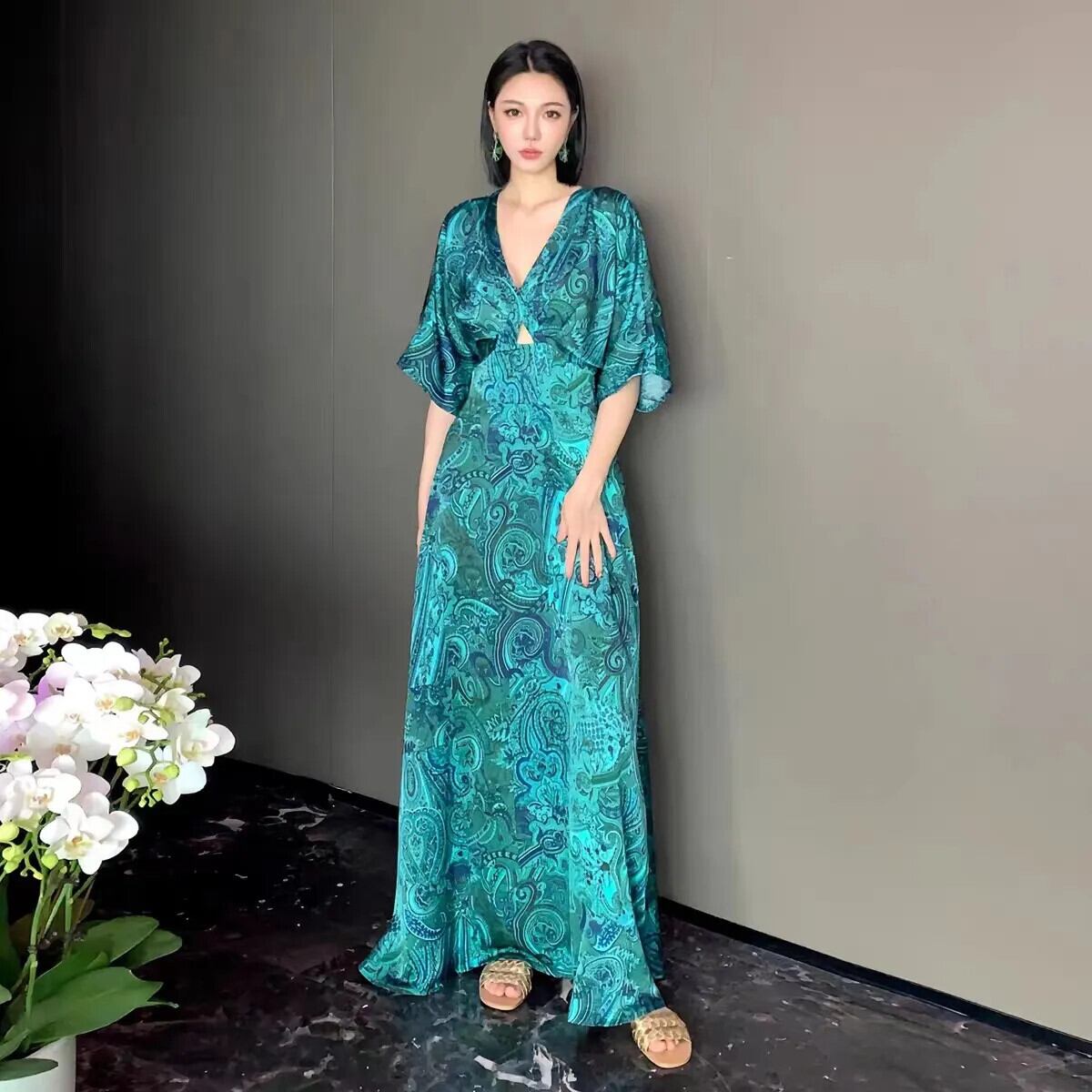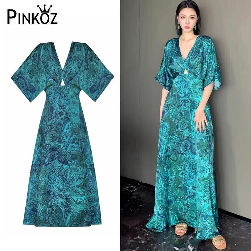 Pinkoz 滑走路デザイナーグリーン花柄 v ネックバットウィングスリーブ春夏マキシロングボヘミアンローブデ mujer ベスト traf ピンク スプリング 春物 サマー 夏物 Vネック
