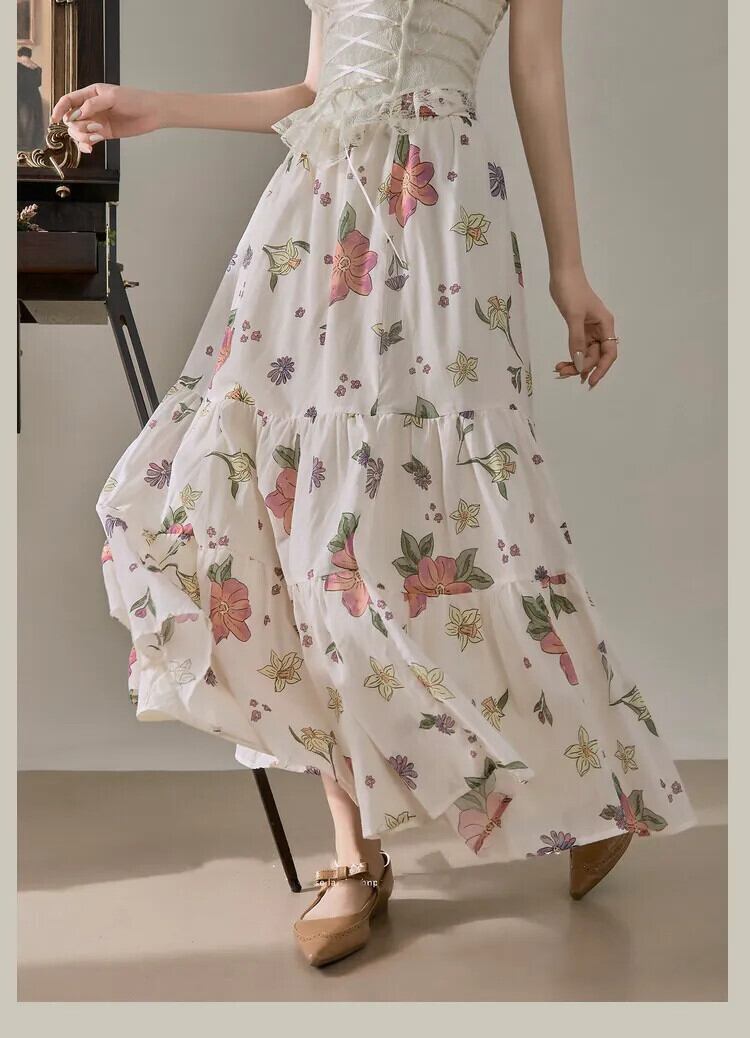 Pinkoz 滑走路デザイナーファッションホリデービーチシックマキシロングスカートカジュアルハイウエスト花柄白かわいい ハイウェスト ピンク ホワイト 大人ガーリー スウィート キュート