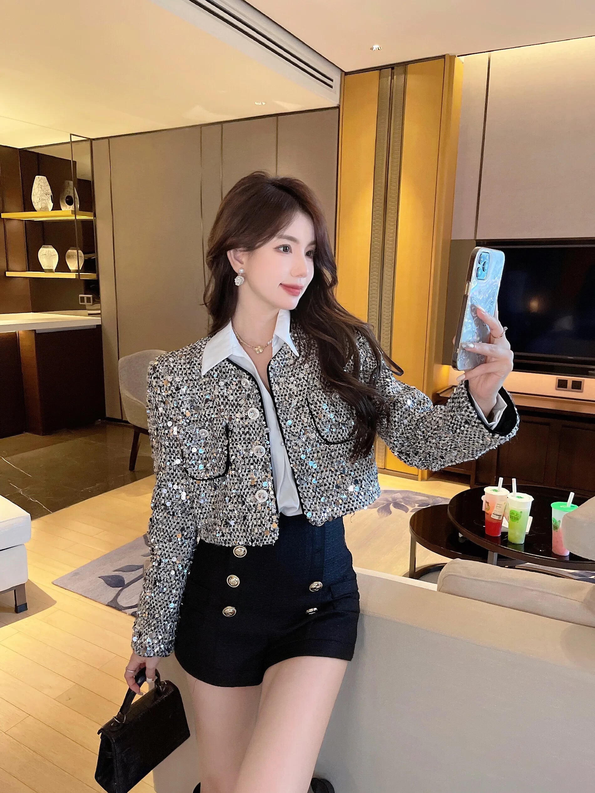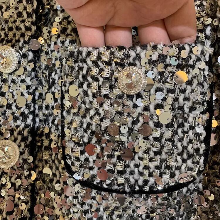 Pinkoz 秋冬スパンコールグレーショートジャケットシングルブレストポケット高級グリッターパーティーオーバーコートヴィンテージ za ピンク オータム 秋物 ウィンター 冬物 ビンテージ