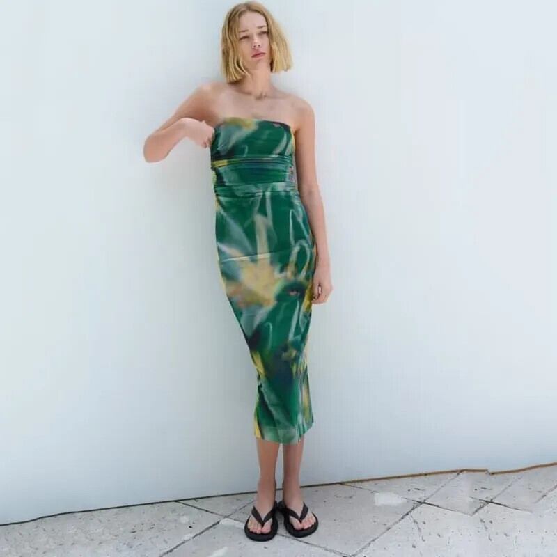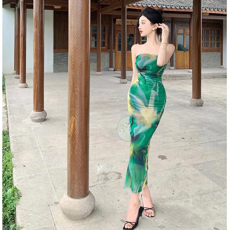 Pinkoz グリーン花柄ストラップレスぬるぬるメッシュドレスファッションホリデーシック弾性ビーチ自由奔放生きるドレスファム ピンク エラスティック 伸縮 フェミニン