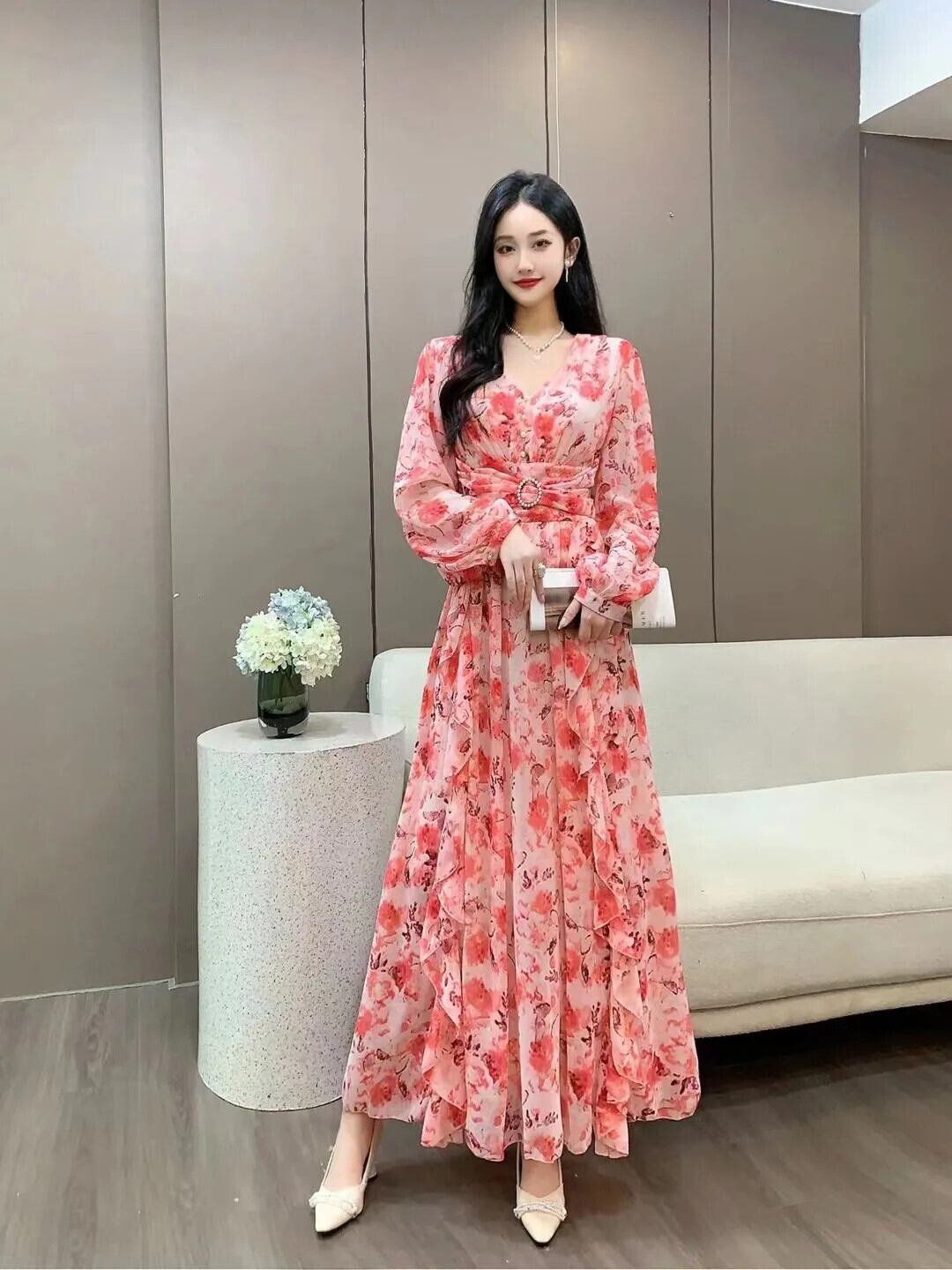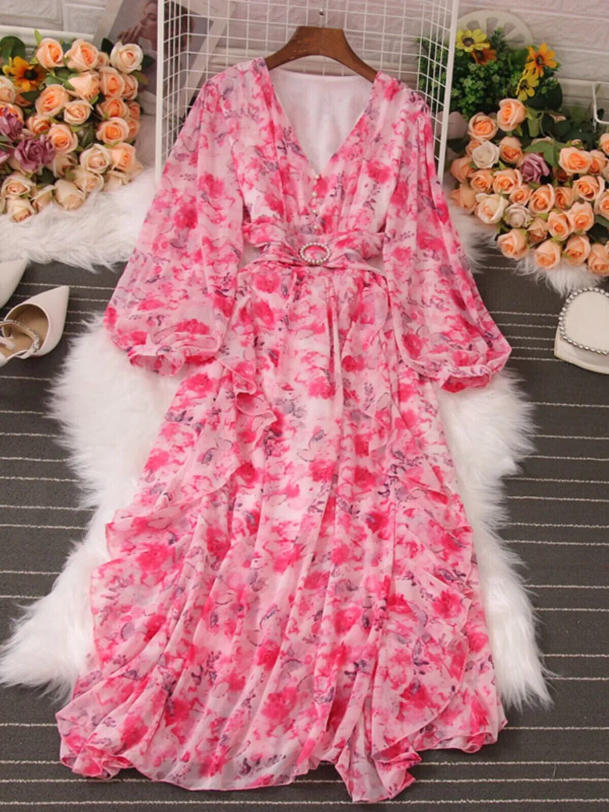 Pinkoz 滑走路デザイナーオレンジ花柄プリントマキシドレス長袖シフォンホリデー自由奔放生きるローブベルト付き ロング ピンク ハーネス