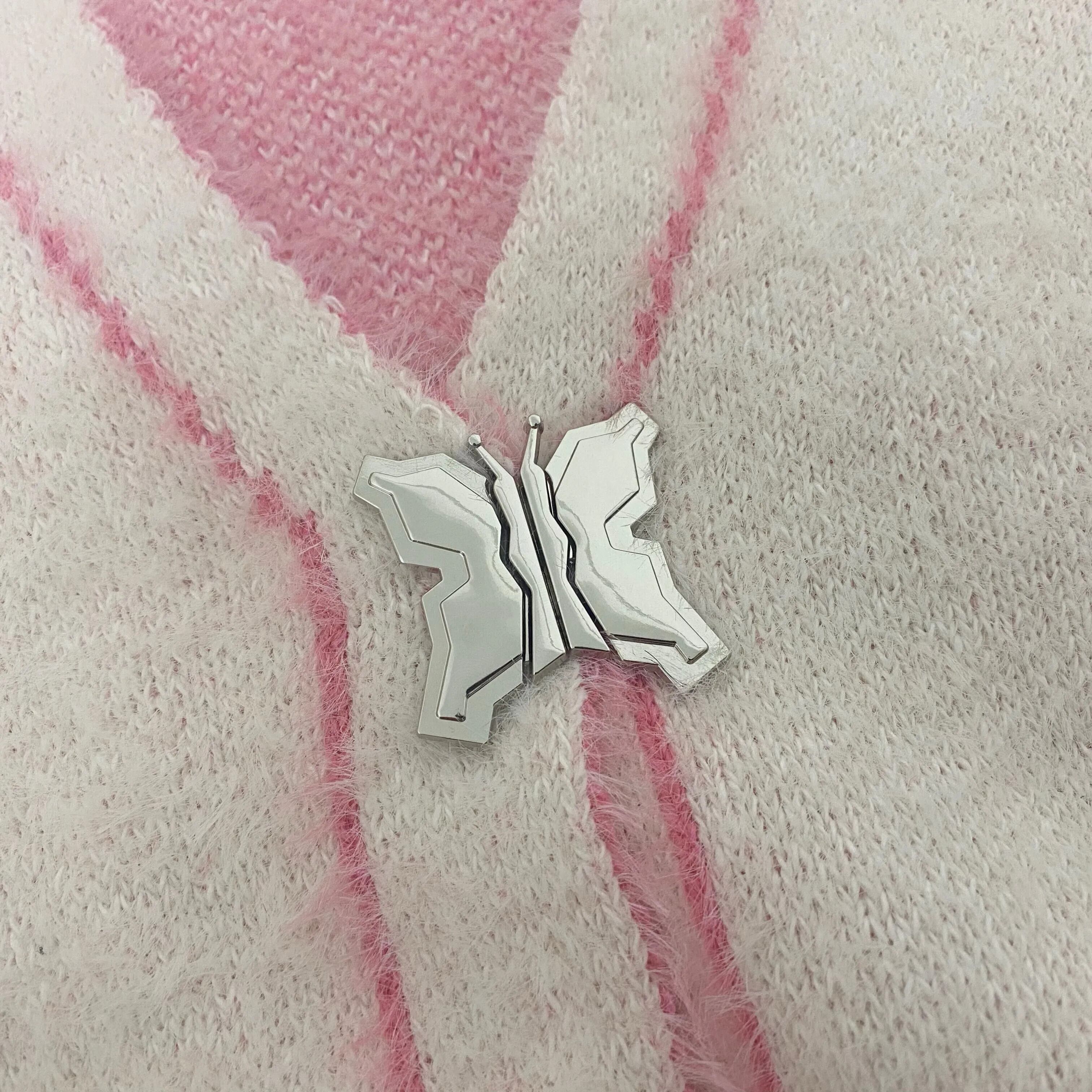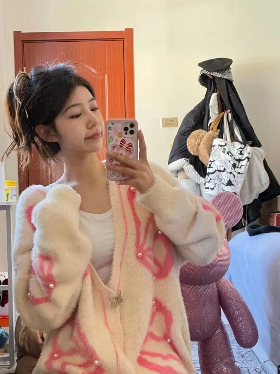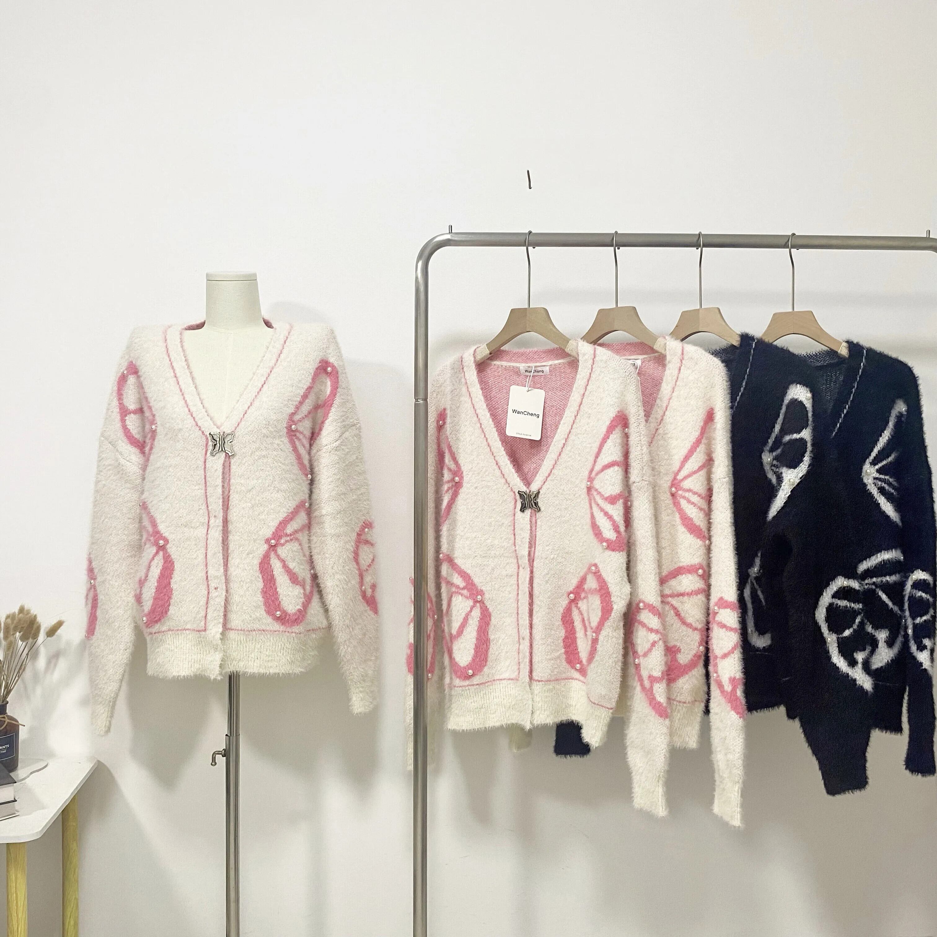 Pinkoz セレブスタイリッシュ秋冬ピンクカーディガンシングルブレストルーズ長袖蝶ボタンモヘアセーターシック ロング オータム 秋物 ウィンター 冬物