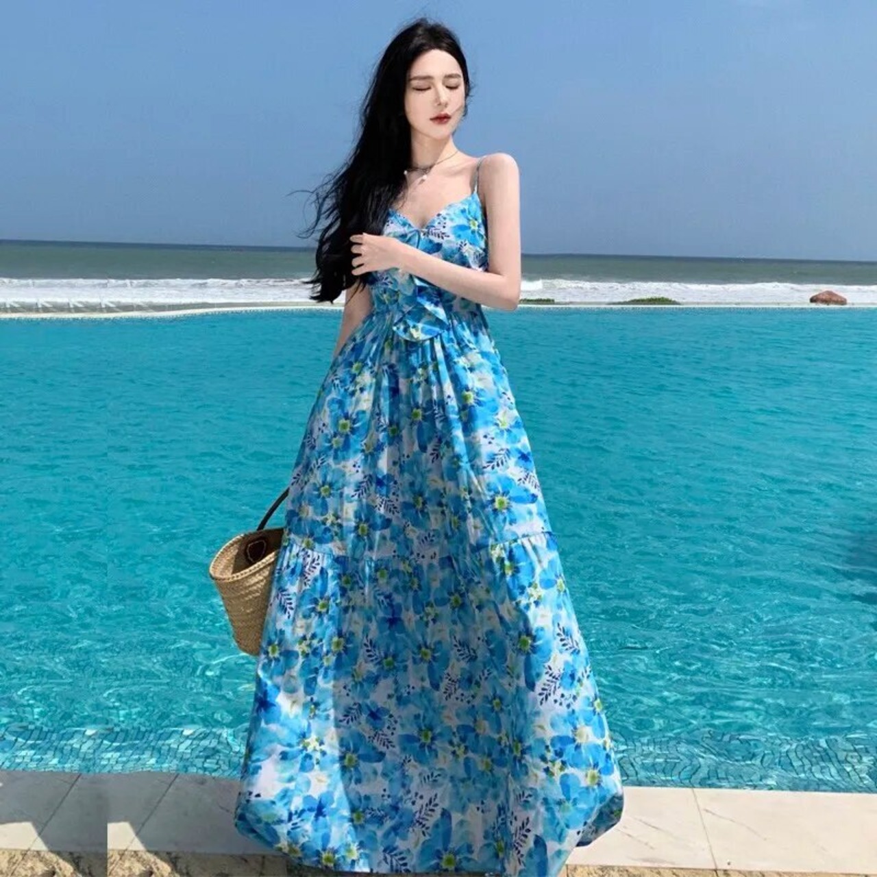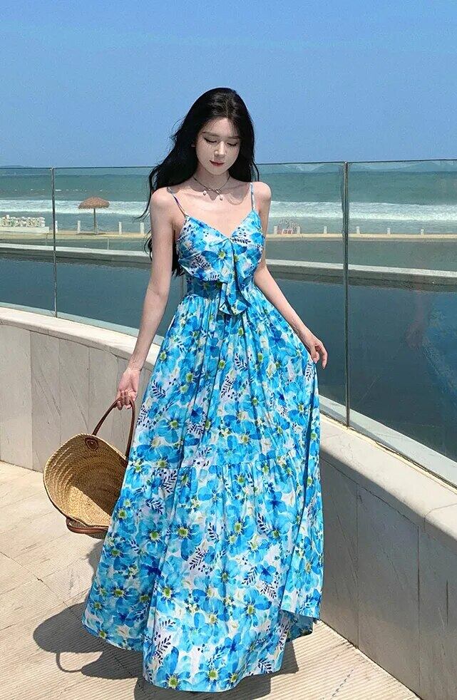Pinkoz ブルー花休日マキシ弓スパゲッティストラップマキシドレスロングカジュアルキャミソールドレス traf zevity サマードレス ピンク リボン 夏物 花柄