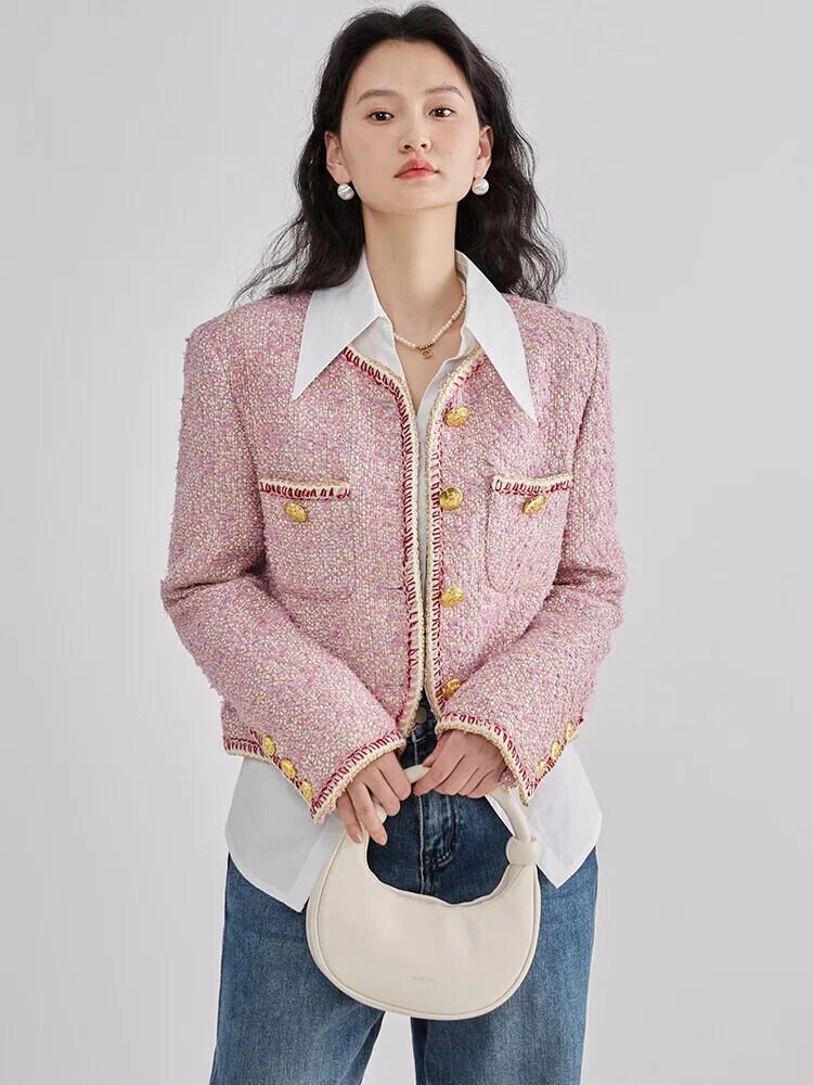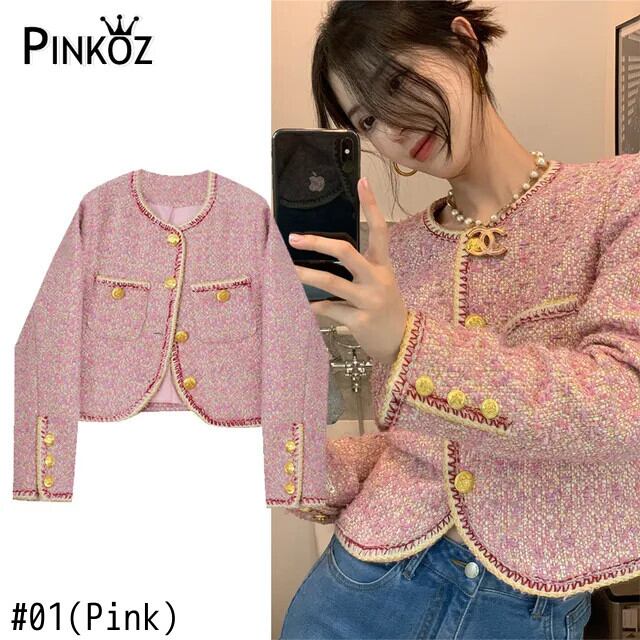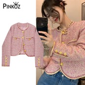 Pinkoz 秋冬ピンクジャケットセレブスタイリッシュツイードシングルブレストボタン O ネックフルスリーブショートオーバーコートトップスヴィンテージ オータム 秋物 ウィンター 冬物 Oネック ビンテージ