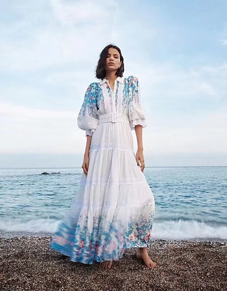 Pinkoz 滑走路デザイナー春秋パッチワークレース花白と青マキシドレスパーティーナイトvestidos ピンク ホワイト ブルー スプリング 春物 オータム 秋物 花柄