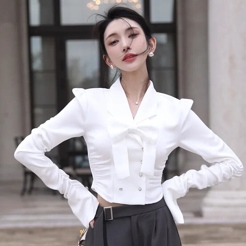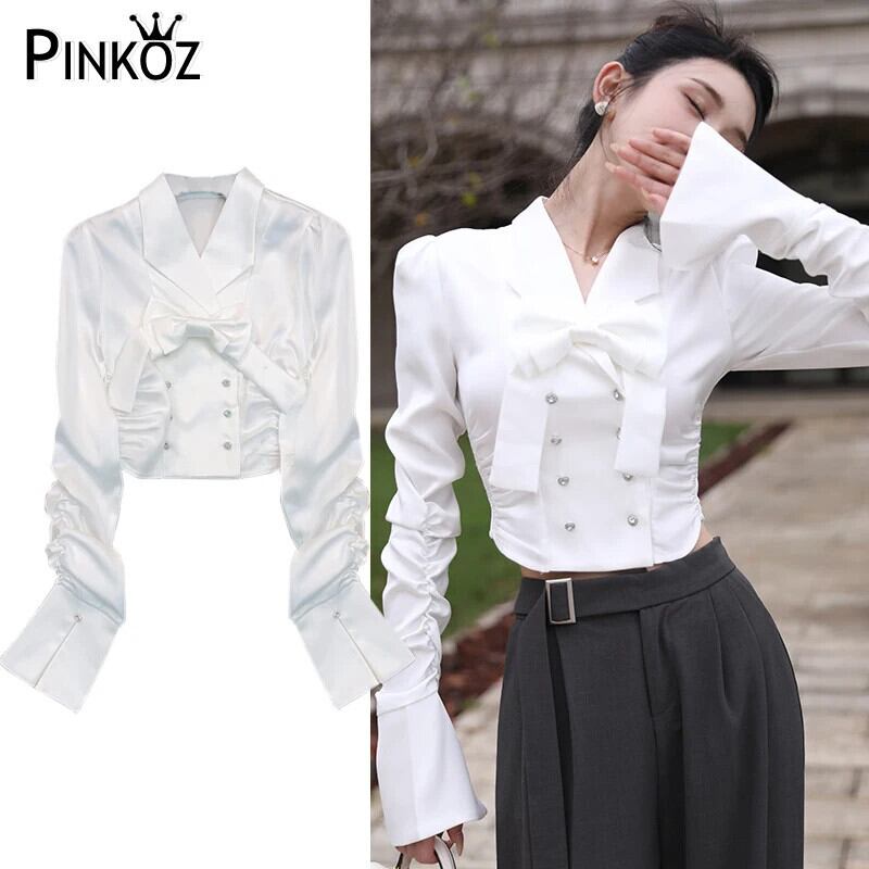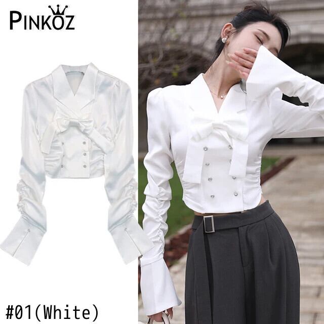 Pinkoz 滑走路デザイナー白弓襟サテン高級ぬるぬるダブルブレストショートシャツロングフレアスリーブトップス ピンク ホワイト リボン