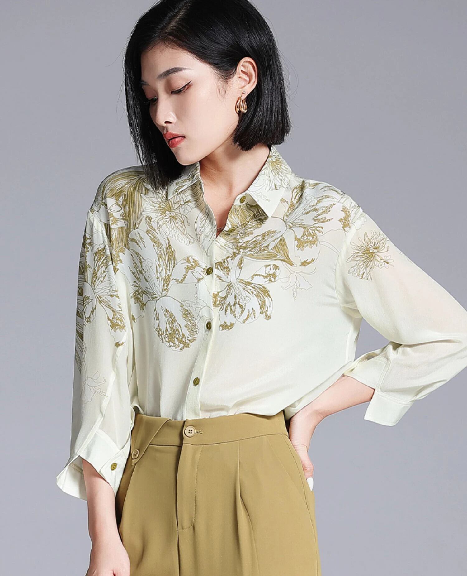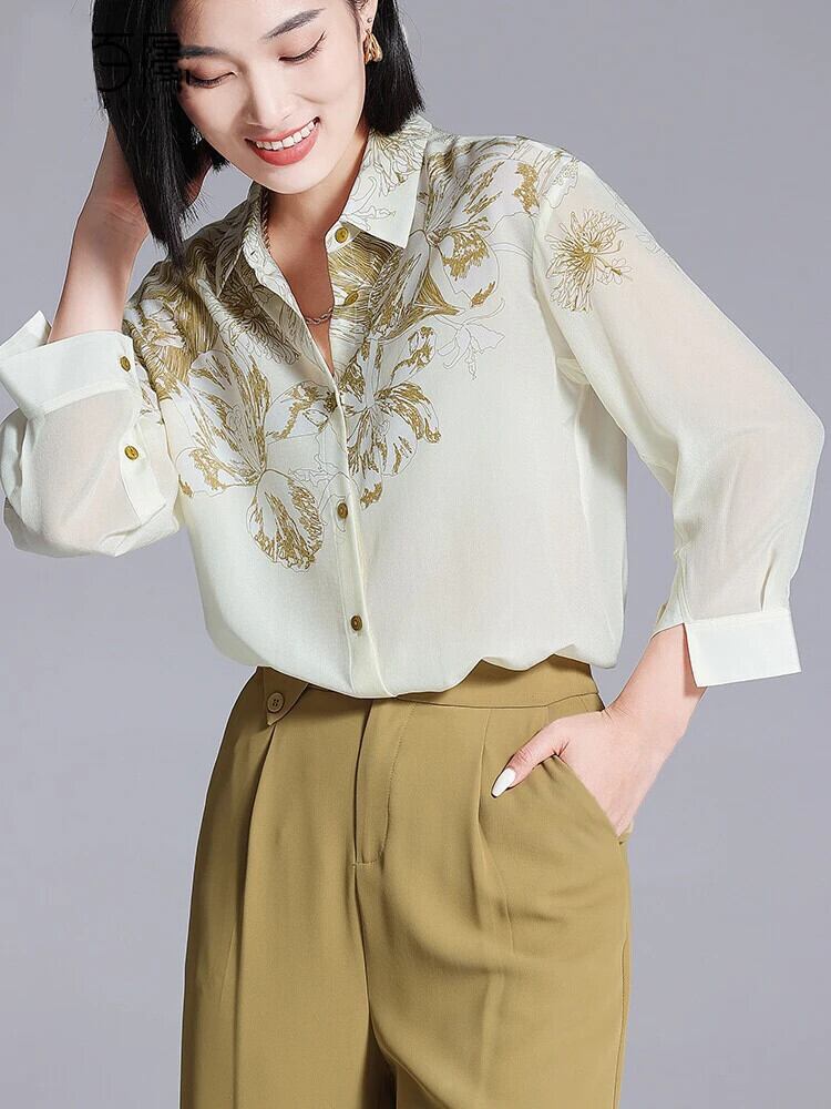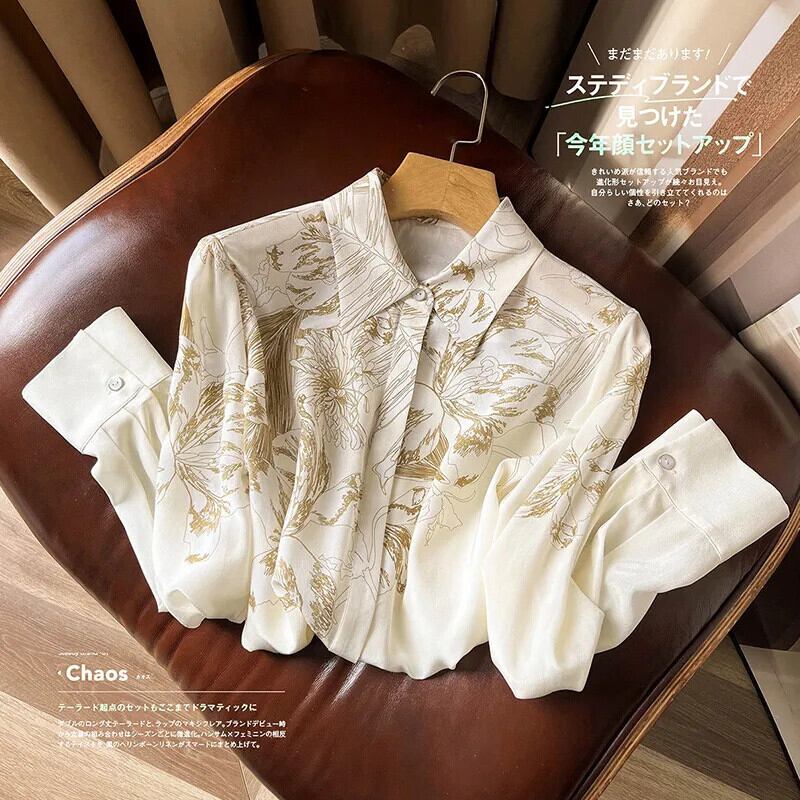 Pinkoz 滑走路デザイナーベージュ花柄ターンダウン襟ルーズシャツエレガントオフィスレディシフォントップスブラウスファム ピンク フェミニン 会社 学校 通勤や通学にも