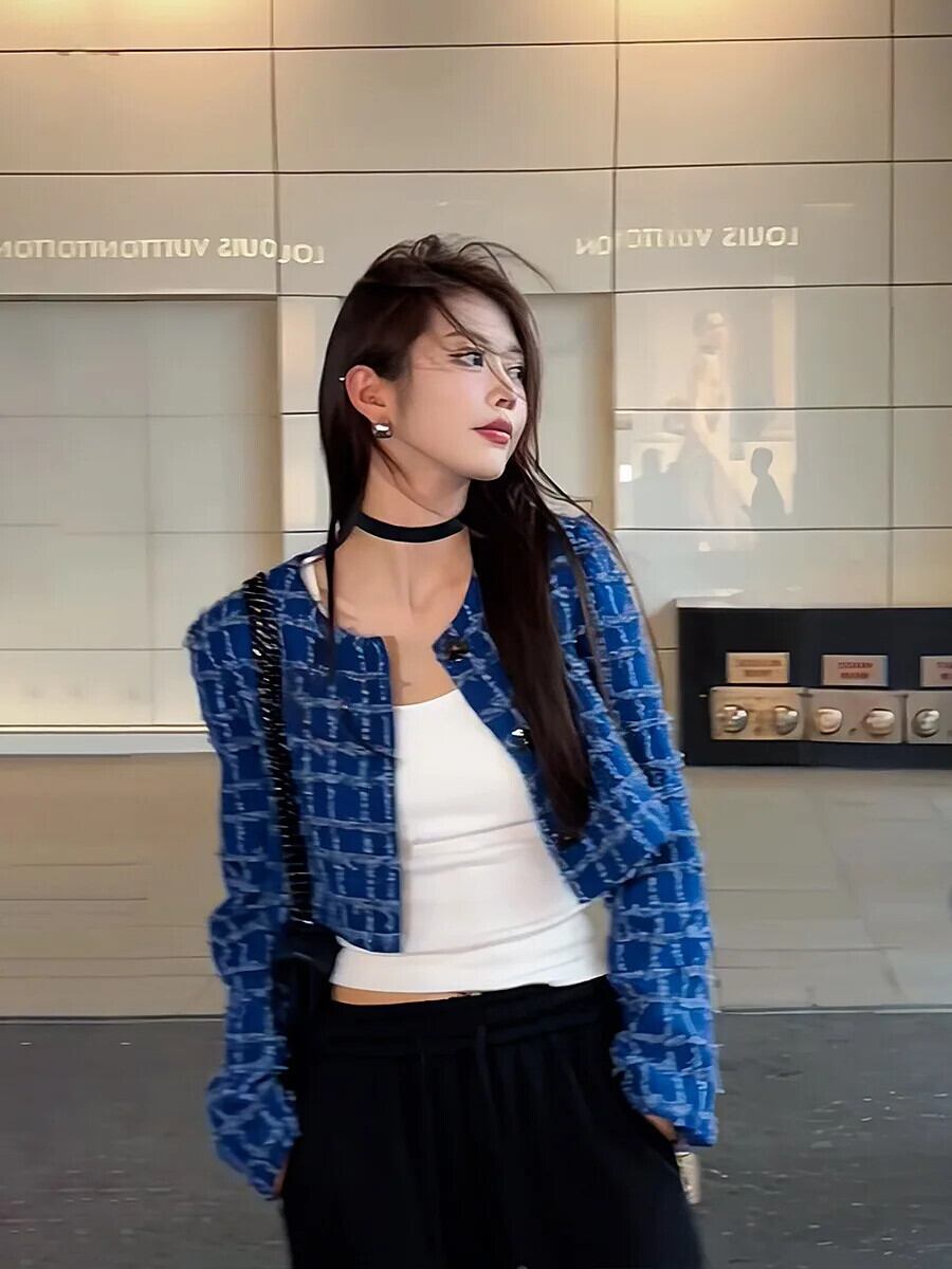 Pinkoz 滑走路デザイナーブルーチェック柄ジャケット o ネック長袖シングルブレストエレガントロイヤルブルーオフィスレディ traf ロング ピンク Oネック 会社 学校 通勤や通学にも