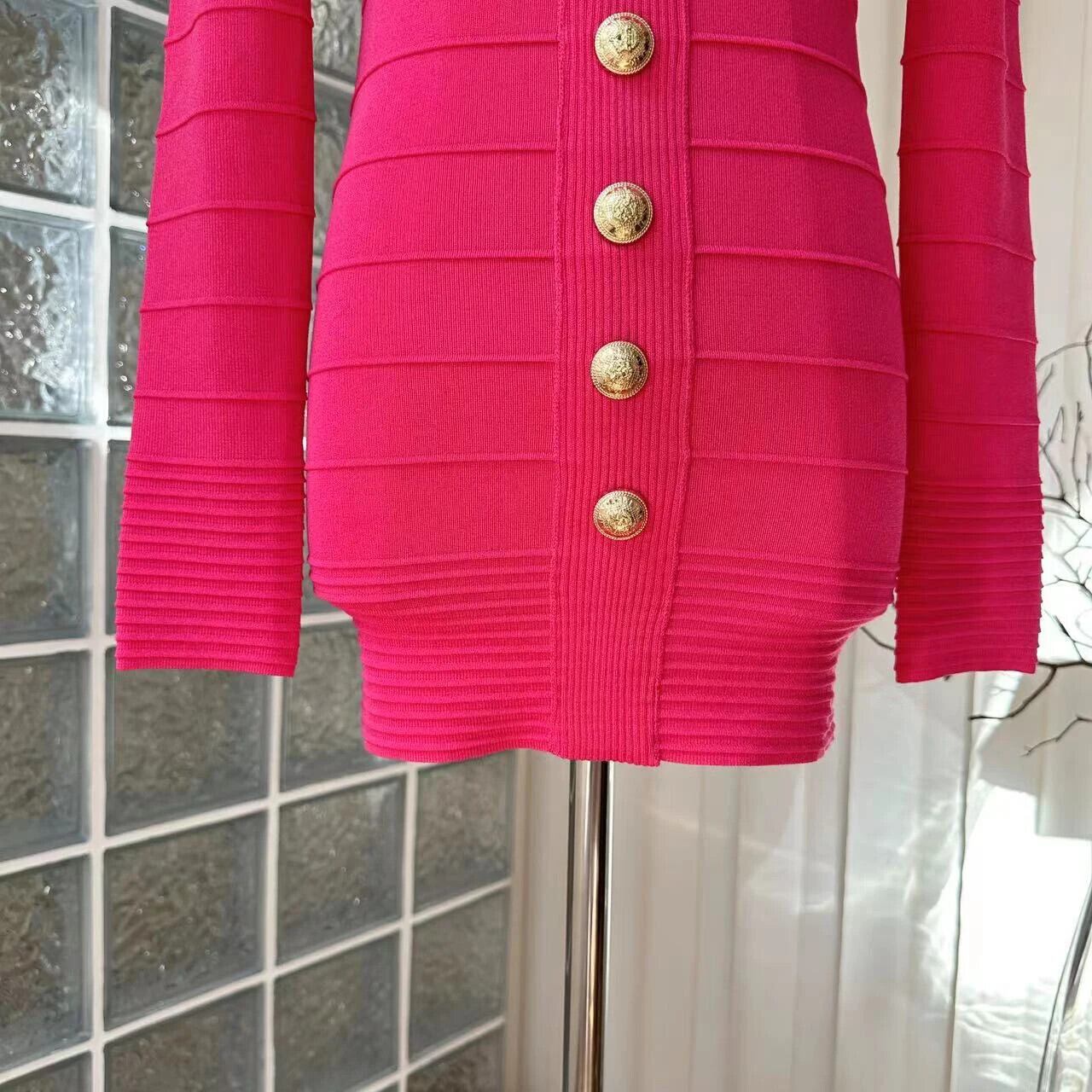 Pinkoz デザイナースラッシュネック長袖ボタンシングルブレストニットミニドレスセレブスタイリッシュパーティードレスフレンチ traf ロング ピンク
