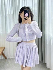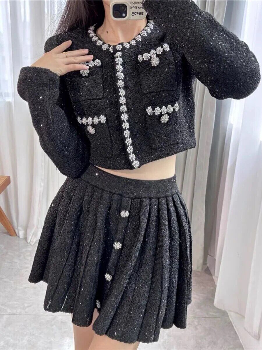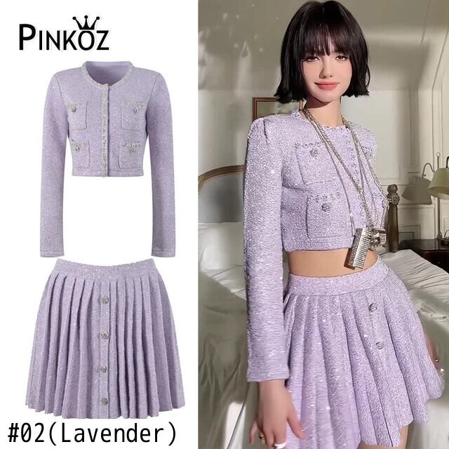 Pinkoz 滑走路デザイナー高級クリスタルボタン 2 個セットニットジャケットカーディガンバイオレットトップスミニプリーツスカートスーツ ピンク