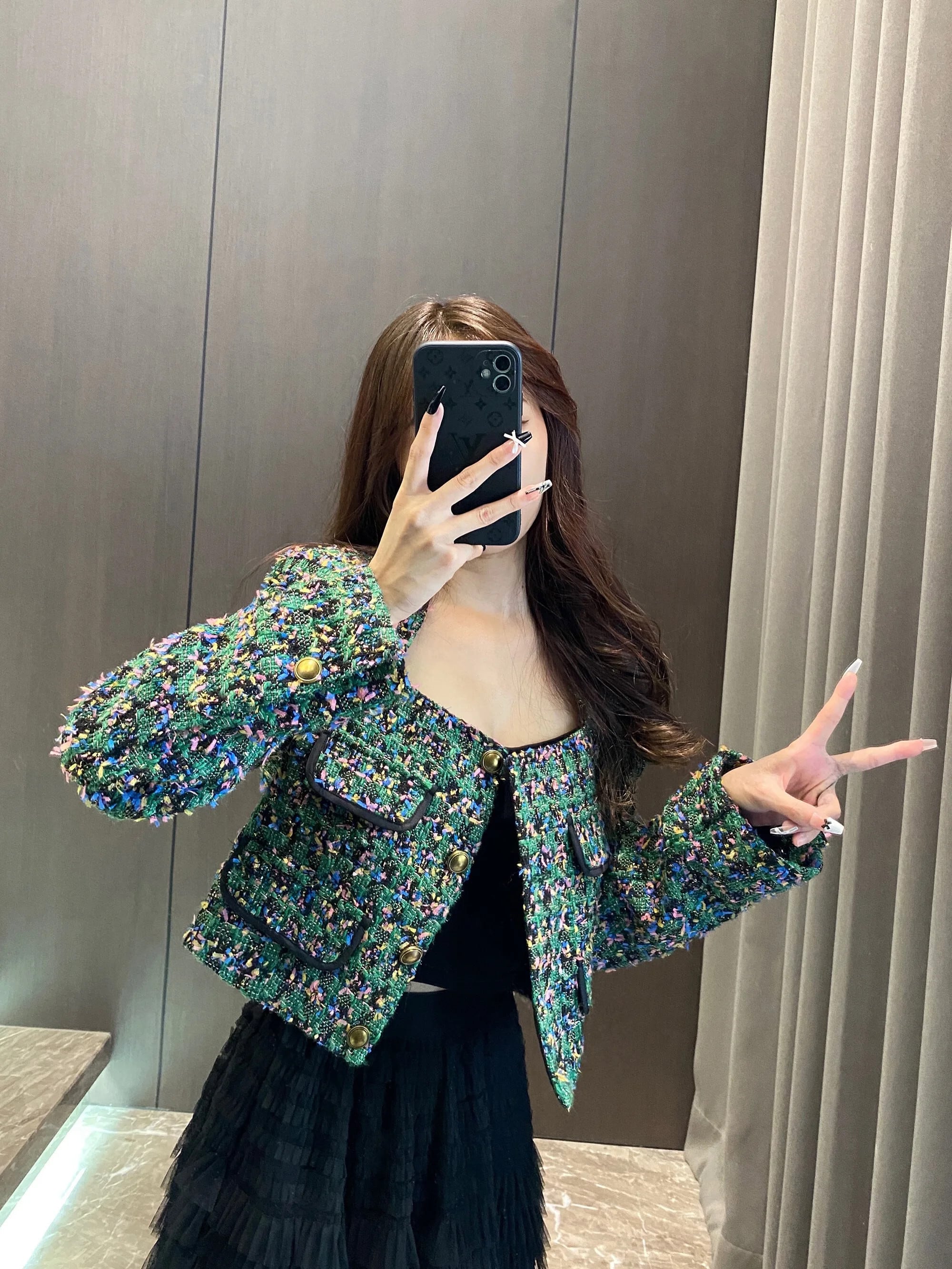 Pinkoz 滑走路デザイナーグリーンチェック柄スクエアカラーシングルポケットシングルブレストショートハイストリート衣類ファッションツイードショート ピンク スクウェア