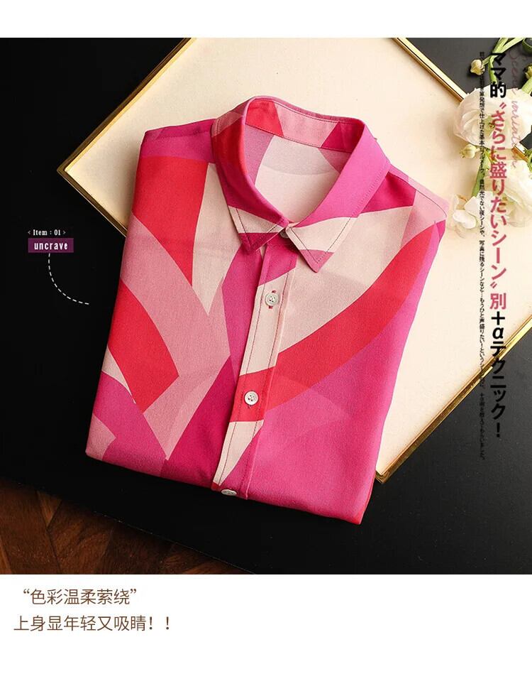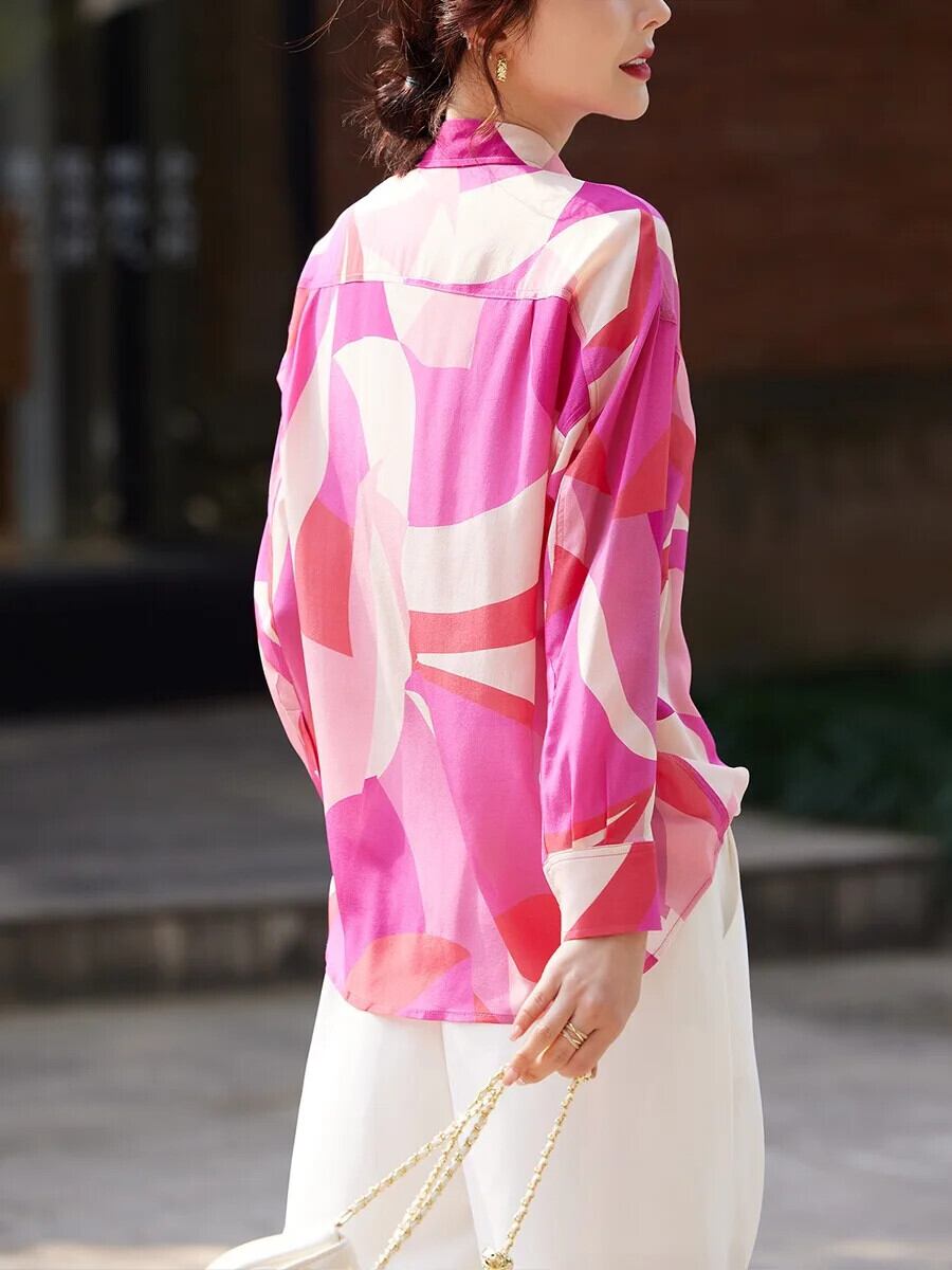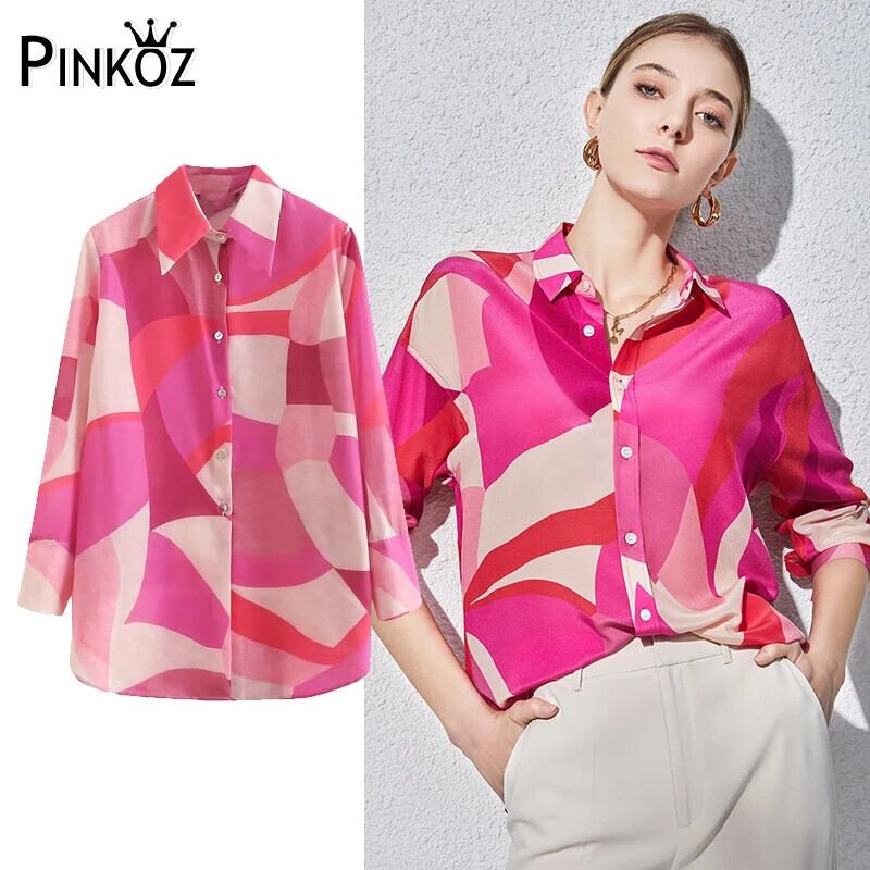 Pinkoz 滑走路デザイナーターンダウン襟ジオメトリパターンプリントシングルブレストルーズシャツヴィンテージファッショントップス traf ピンク ビンテージ