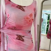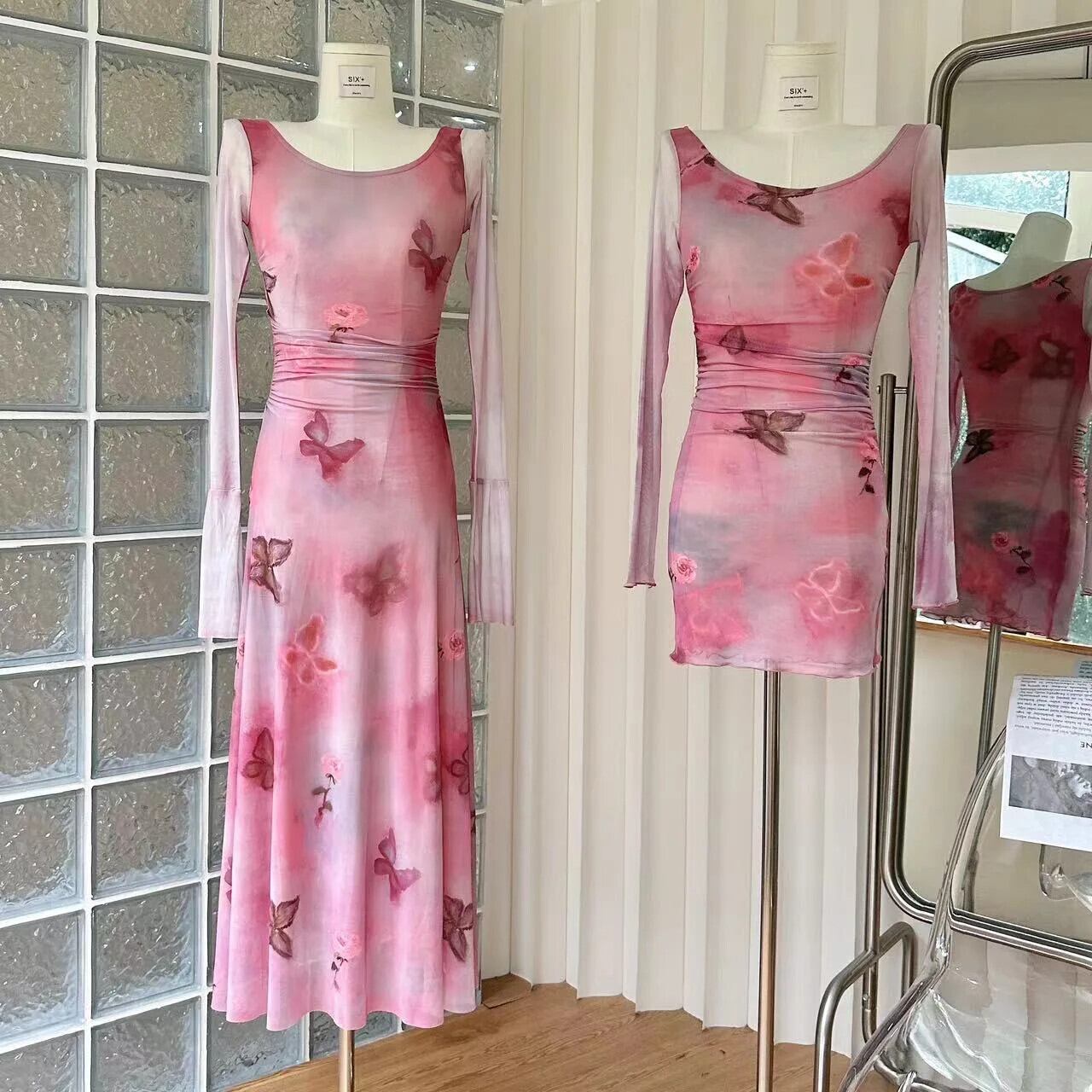 Pinkoz 弾性 O ネックフレアスリーブピンク蝶マキシドレスぬるぬるシックストリートファム Vestidos ヴィンテージ traf エラスティック 伸縮 Oネック フェミニン ビンテージ