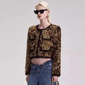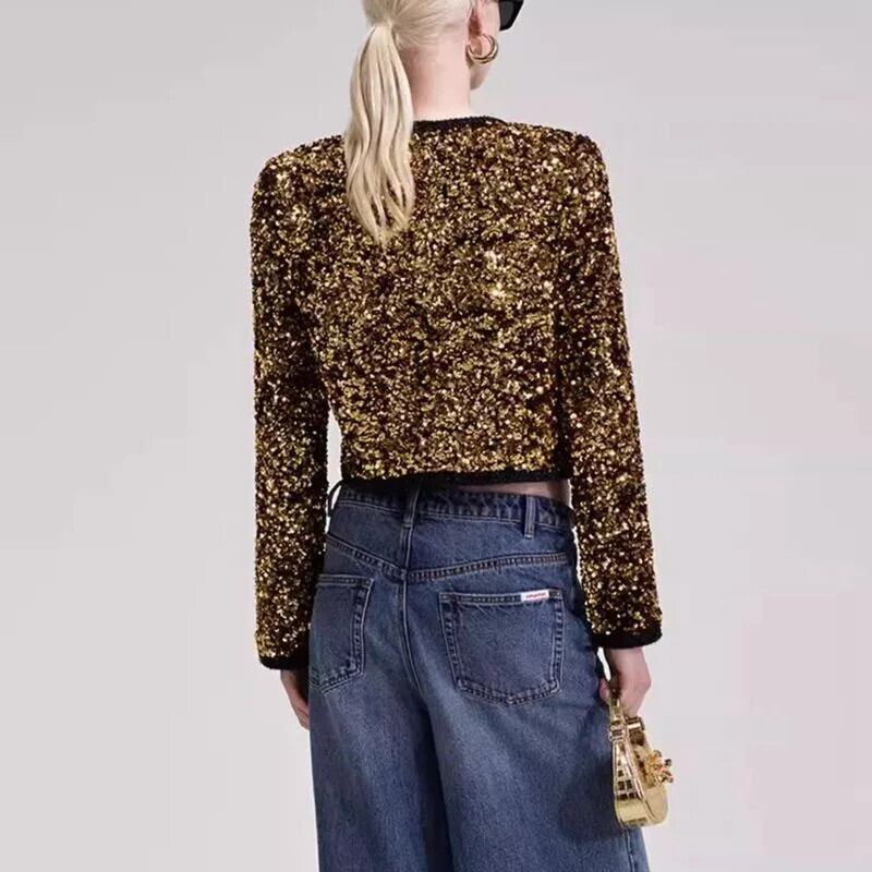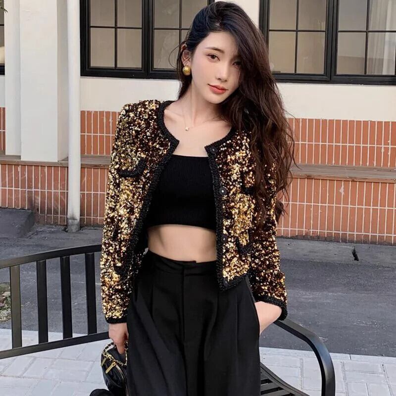 Pinkoz 滑走路デザイナーゴールドスパンコール O ネックポケットショートエレガントジャケット秋冬パーティーファッション高級オーバーコートヴィンテージ ピンク オータム 秋物 ウィンター 冬物 Oネック ビンテージ