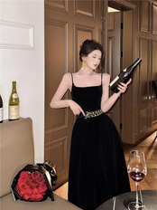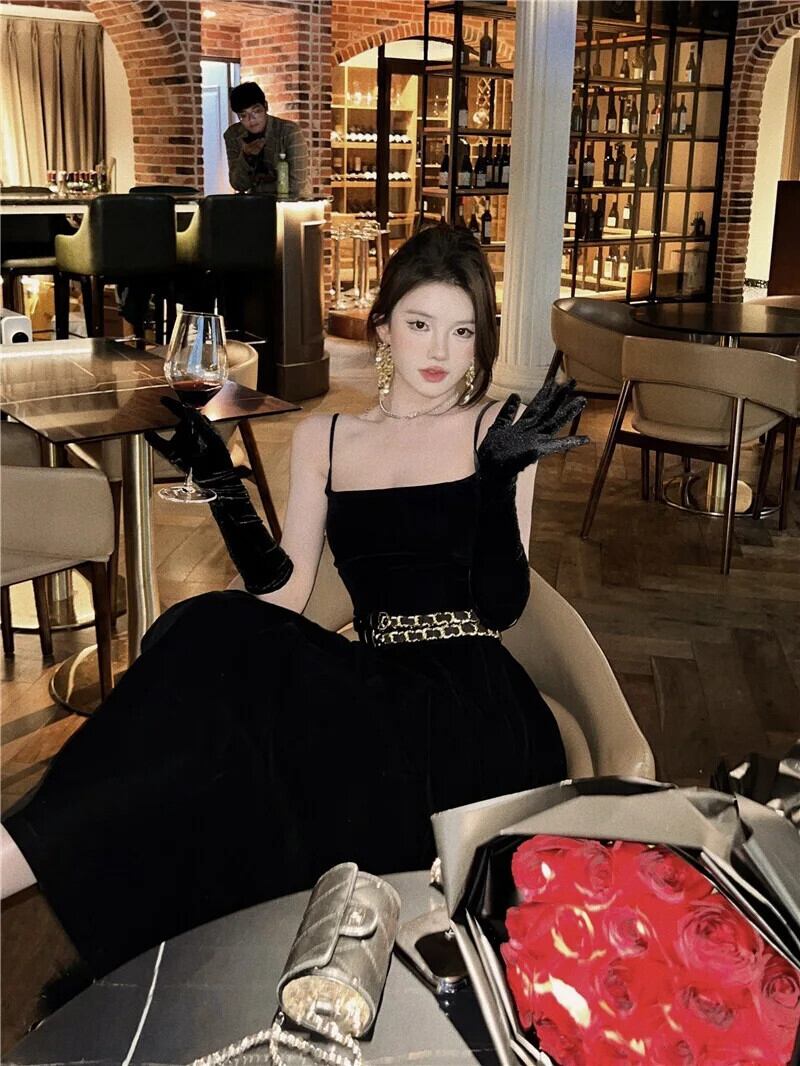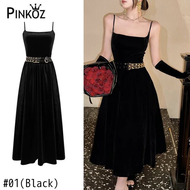 Pinkoz 滑走路デザイナー黒ベルベットミディスパゲッティストラップドレス夏春キャミソール Vestidos ベルトヴィンテージローブ ピンク ブラック スプリング 春物 サマー 夏物 ハーネス ビンテージ