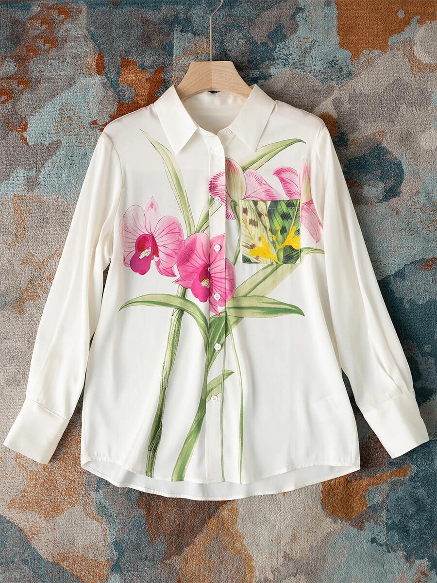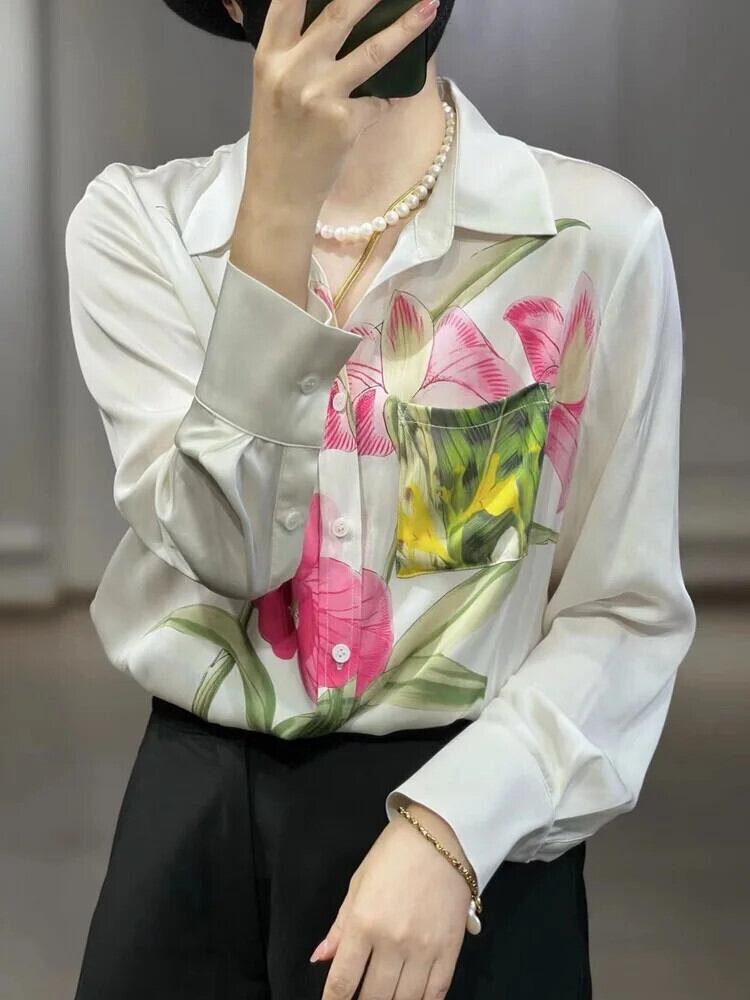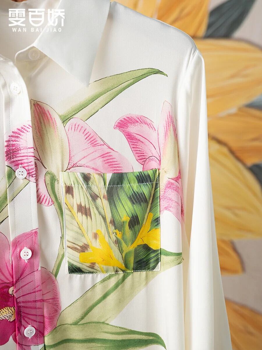 Pinkoz 滑走路ユリフラワープリントターンダウン襟ルーズサイズシャツ長袖シングルブレスト春夏トップスブラウス 4xl ロング ピンク スプリング 春物 サマー 夏物 フラワーデザイン