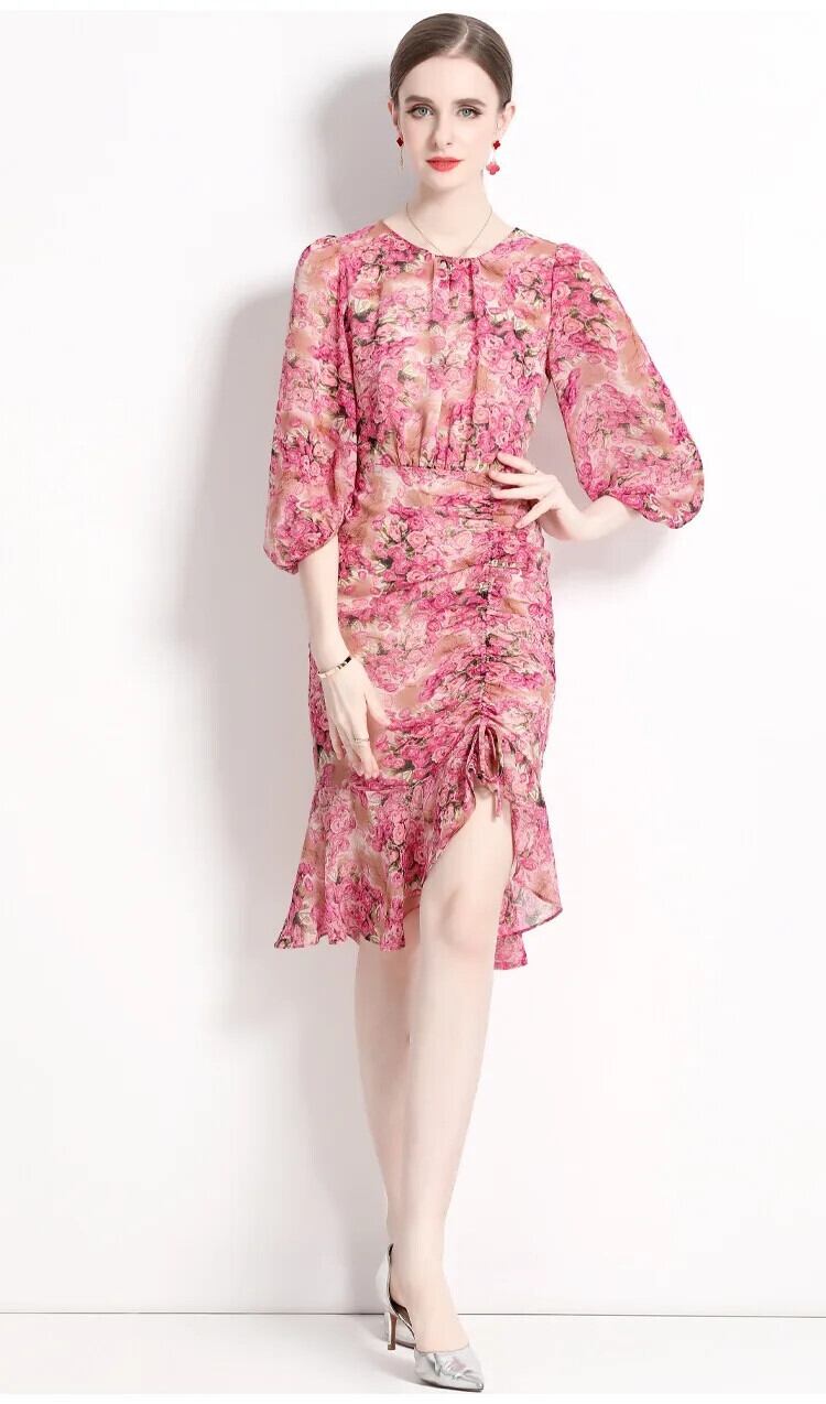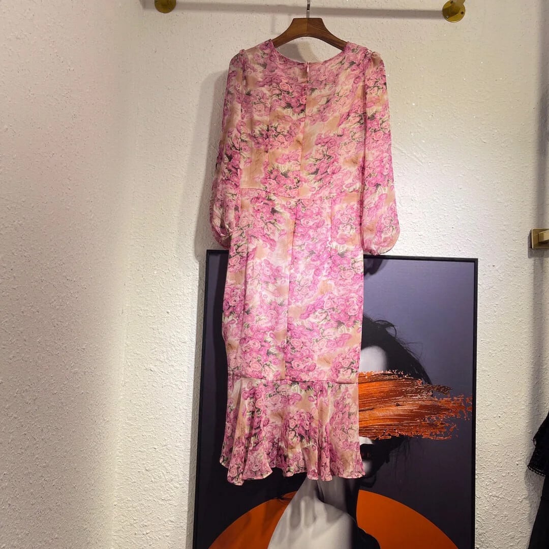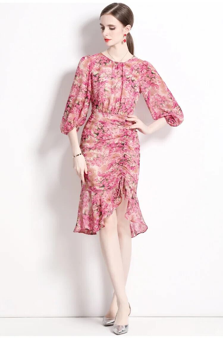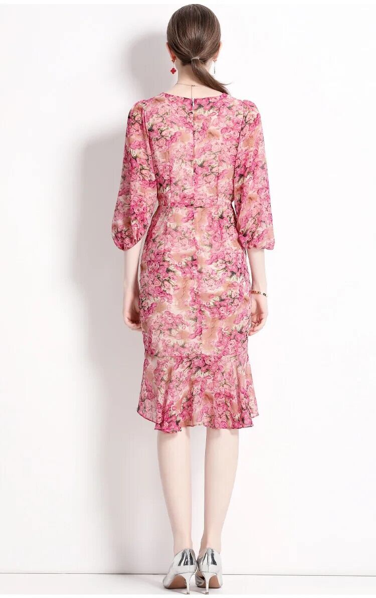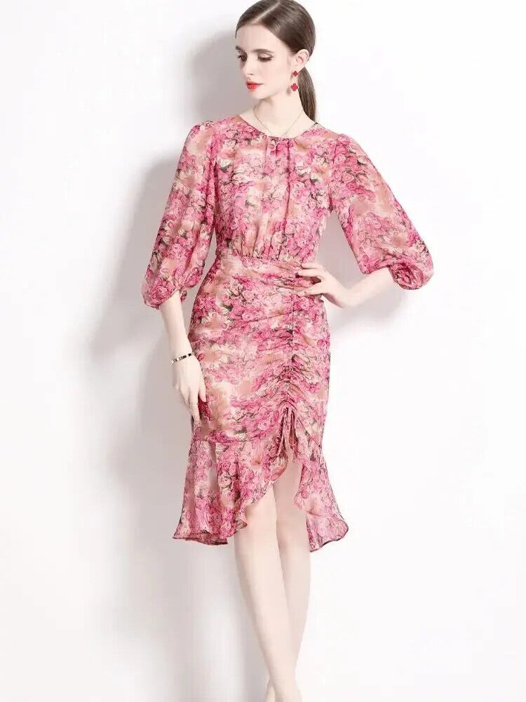 Pinkoz ホリデーピンク花柄プリント o ネックランタン半袖ミディぬるぬるフリルドレスシックローブデ mujer traf ハーフスリーブ ラッフル Oネック
