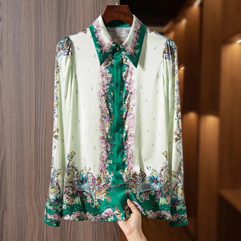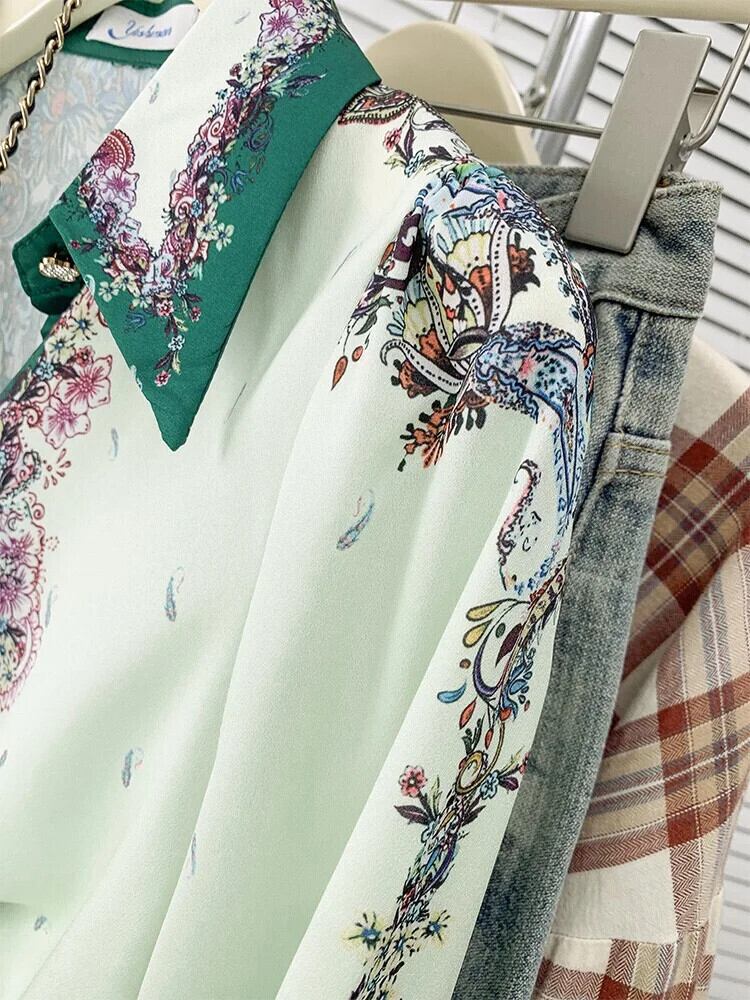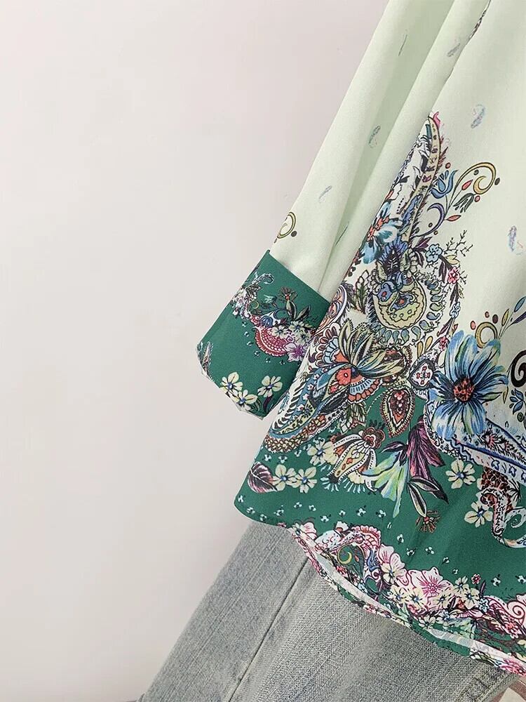 Pinkoz デザイナー緑白花柄プリントターンダウン襟長袖シャツファッション衣類ブラウスファムトップス 3XL ロング ピンク ホワイト フェミニン グリーン
