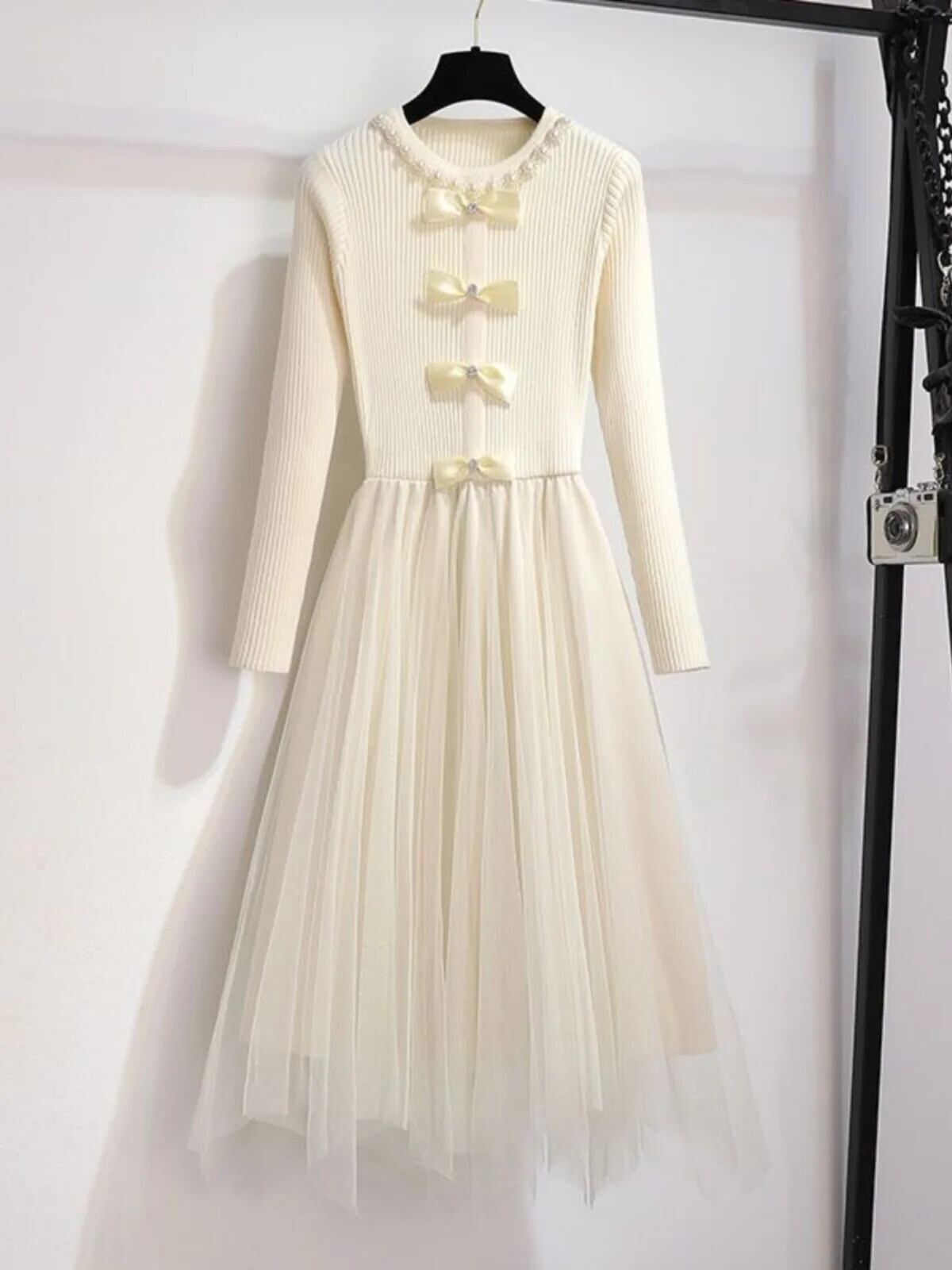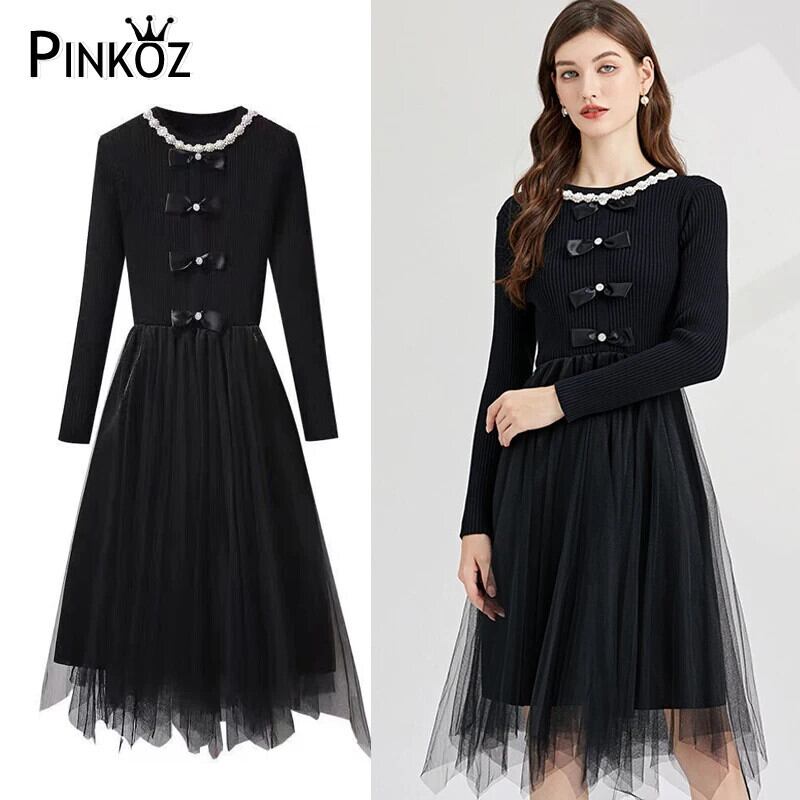 Pinkoz デザイナースタイリッシュニットパッチワークメッシュ不規則ドレス弓 O ネック長袖エレガント滑走路秋ドレス Vestidos ロング ピンク リボン オータム 秋物 Oネック