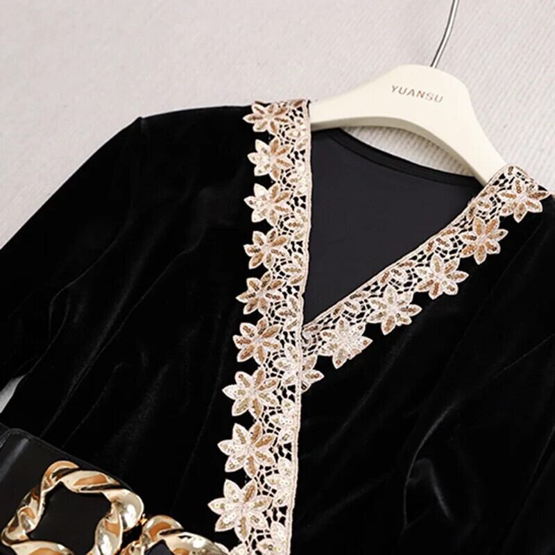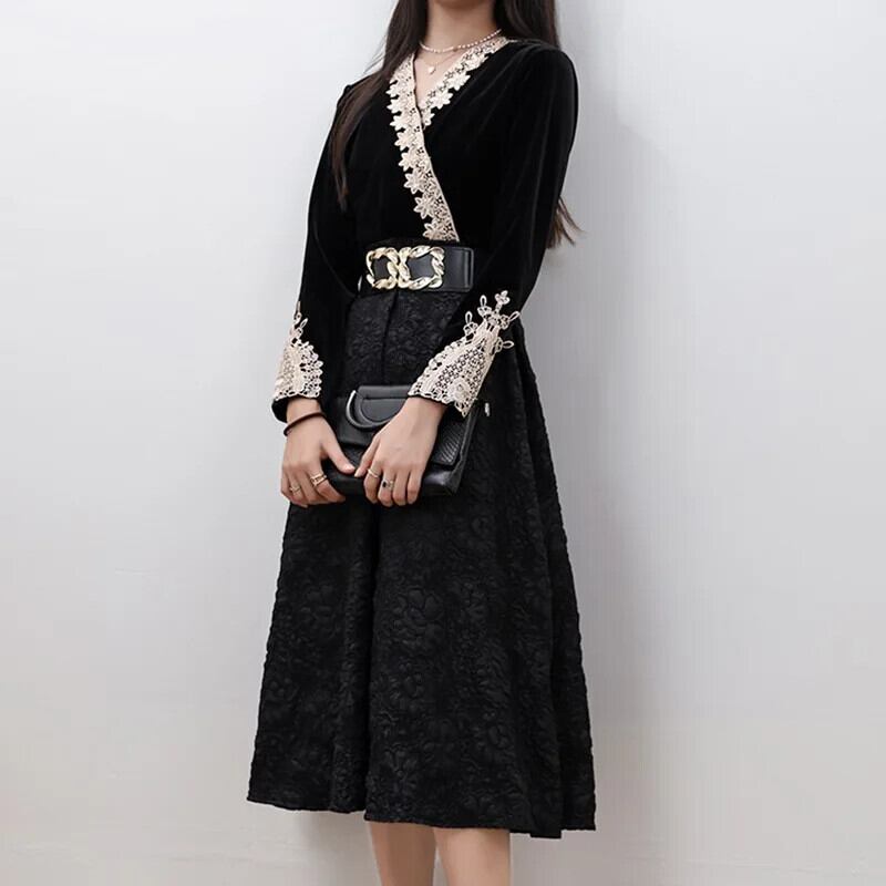 Pinkoz エレガントヴィンテージ Vestidos V ネック長袖パッチワークレースジャカード A ラインドレスとベルトファッションボヘミアンローブ traf ロング ピンク ハーネス Vネック Aライン ビンテージ