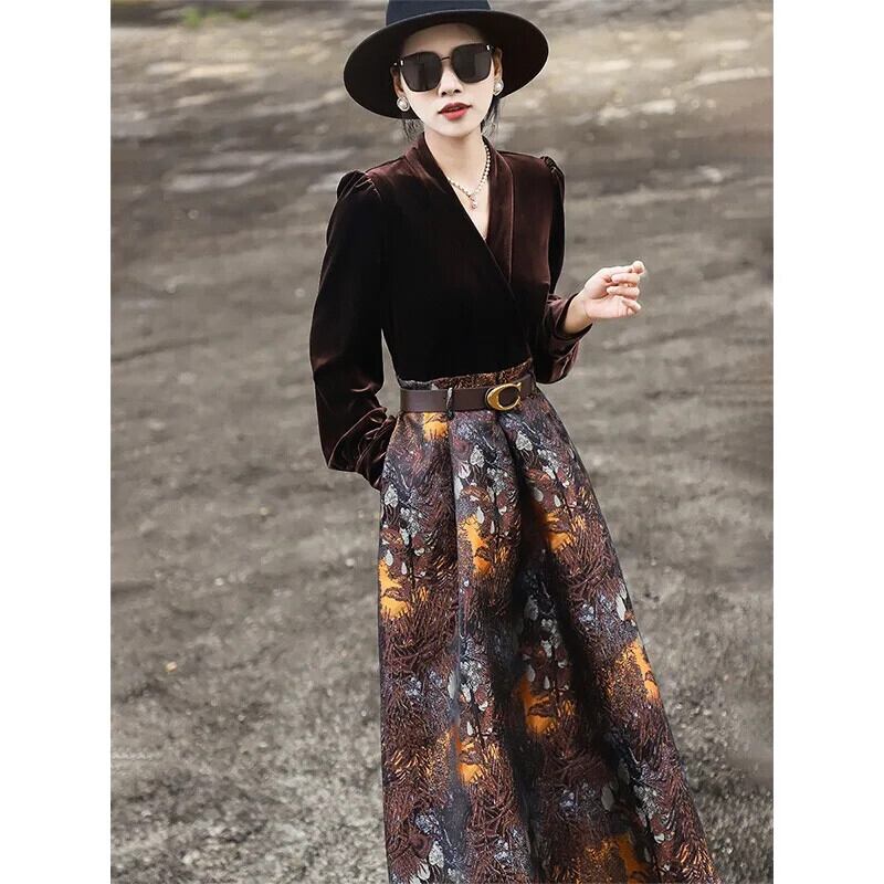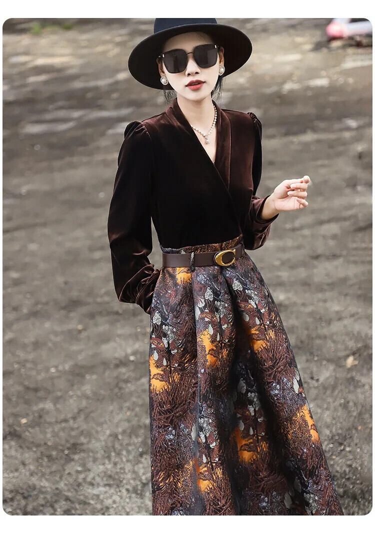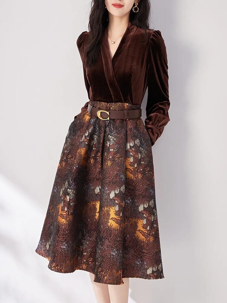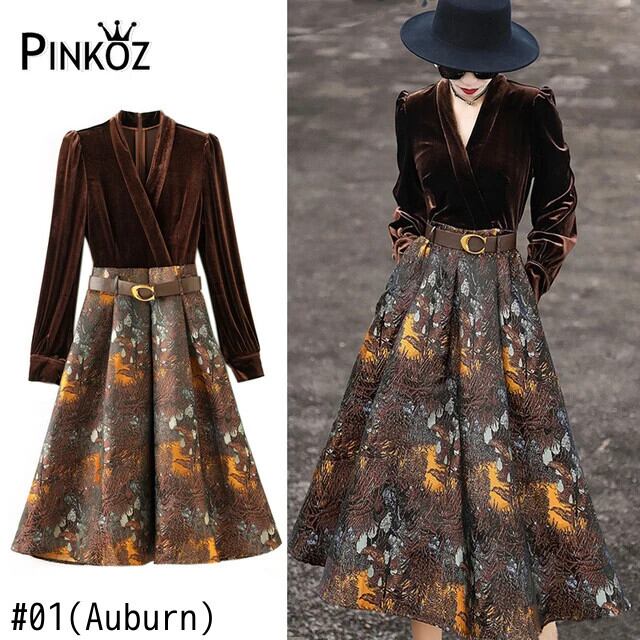 Pinkoz 秋冬ブラウンベルベット花柄ミディドレス V ネック A ラインエレガントオフィスレディファッション衣類ローブとベルト ピンク オータム 秋物 ウィンター 冬物 ハーネス Vネック Aライン 会社 学校 通勤や通学にも