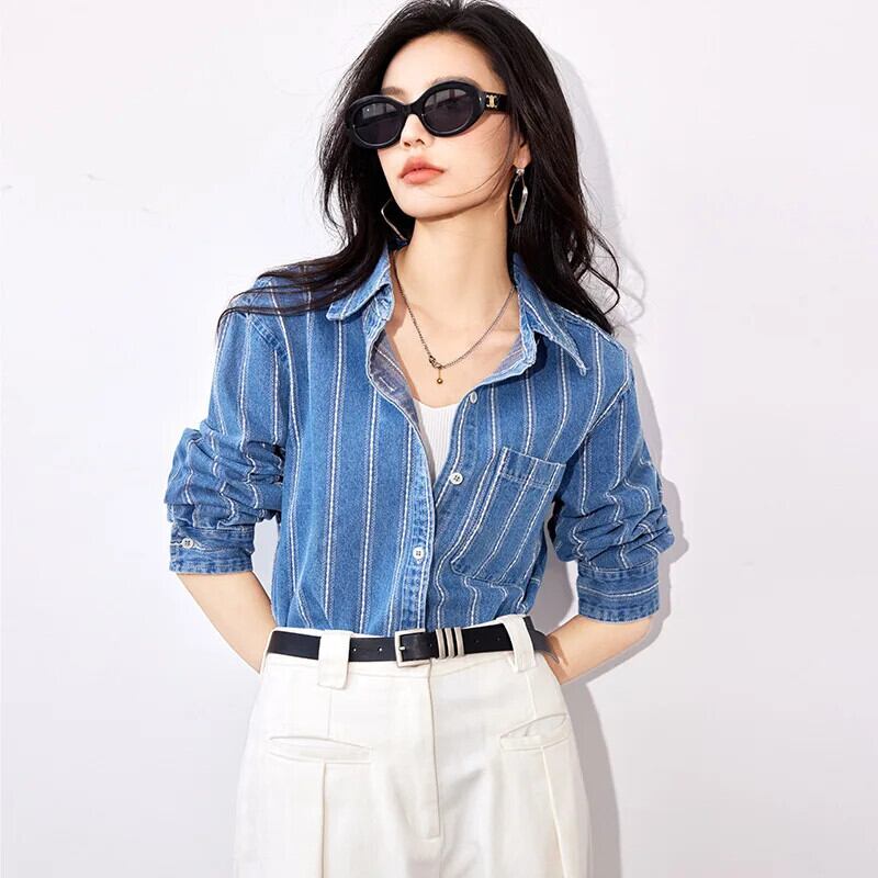 Pinkoz 2024 春秋ブルーストライプルーズデニムジャケットシングルブレストターンダウンカラーカジュアルエレガントハイストリートシャツ ピンク スプリング 春物 オータム 秋物