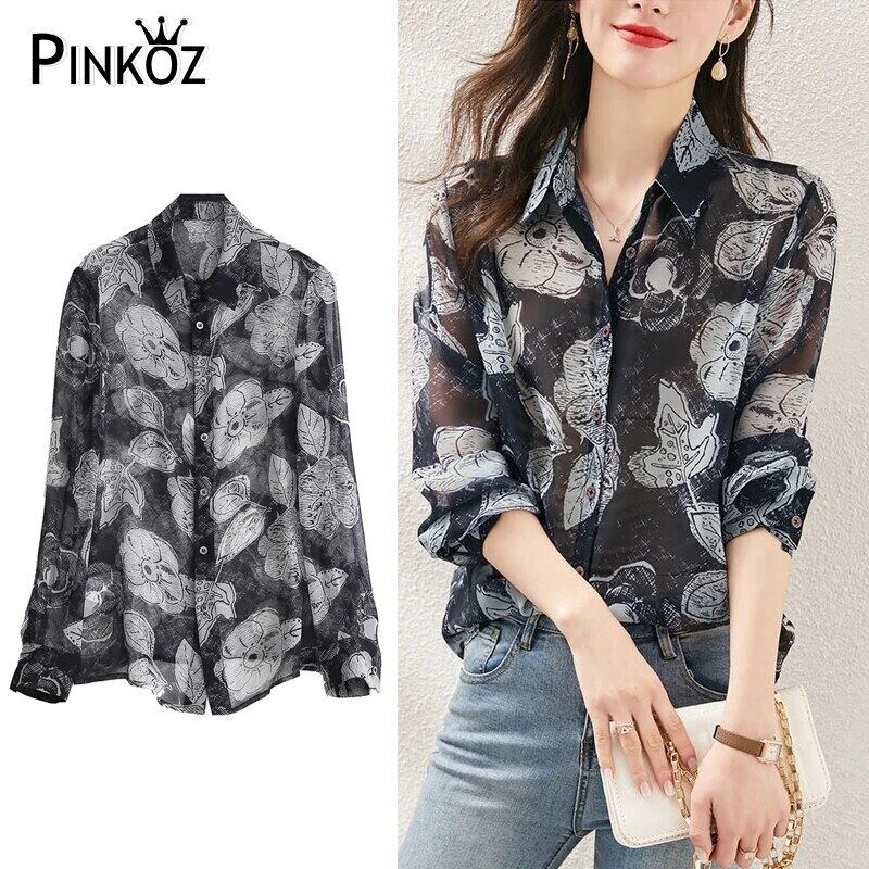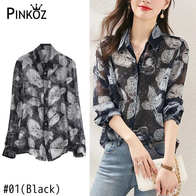 Pinkoz 滑走路デザイナー黒花柄ルーズシフォン因果ブラウス長袖春夏ストリートシックファッション布 ロング ピンク ブラック スプリング 春物 サマー 夏物
