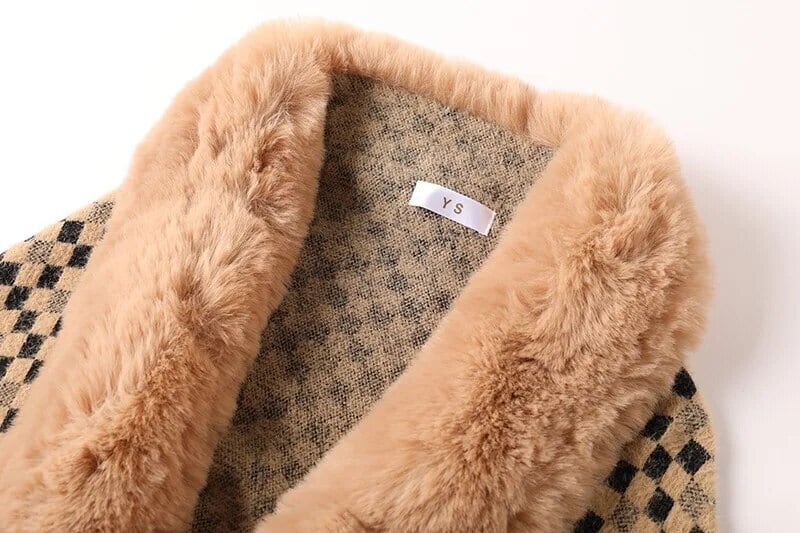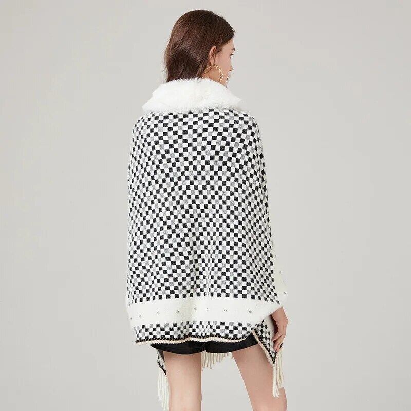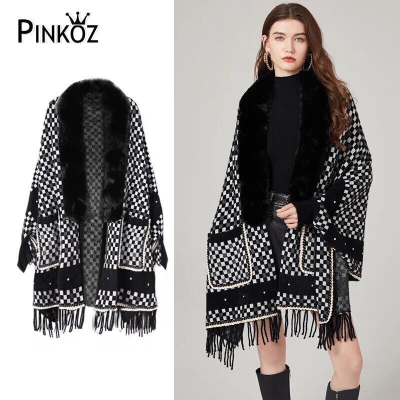 Pinkoz フェイクファー襟フリンジショールニットカーディガンストリートケープトップスレディースマントセーターコート ピンク