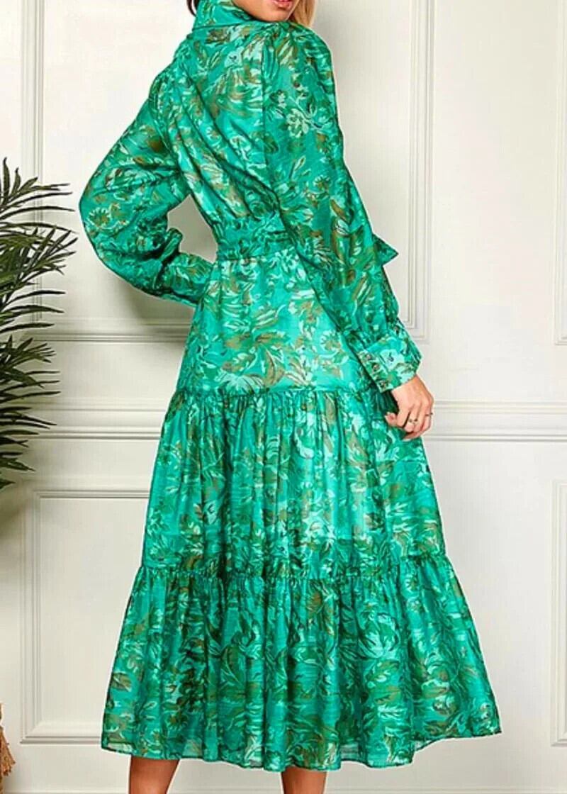 Pinkoz デザイナーファッショングリーン花柄ターンダウン襟長袖マキシドレスシングルブレストボタン Veastidos ローブ ロング ピンク