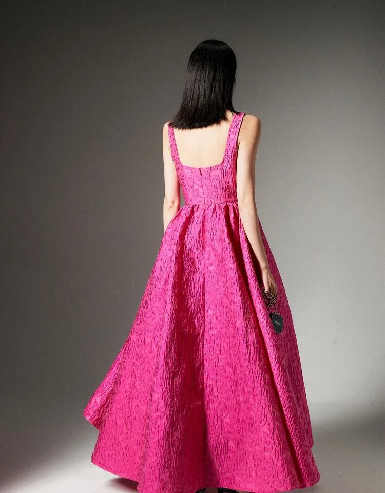 Pinkoz 春夏 2024 ファッションフクシアスクエアカラースパゲッティストラップパーティー A ライン夜会マキシドレスフェスティバル ピンク スプリング 春物 サマー 夏物 Aライン スクウェア