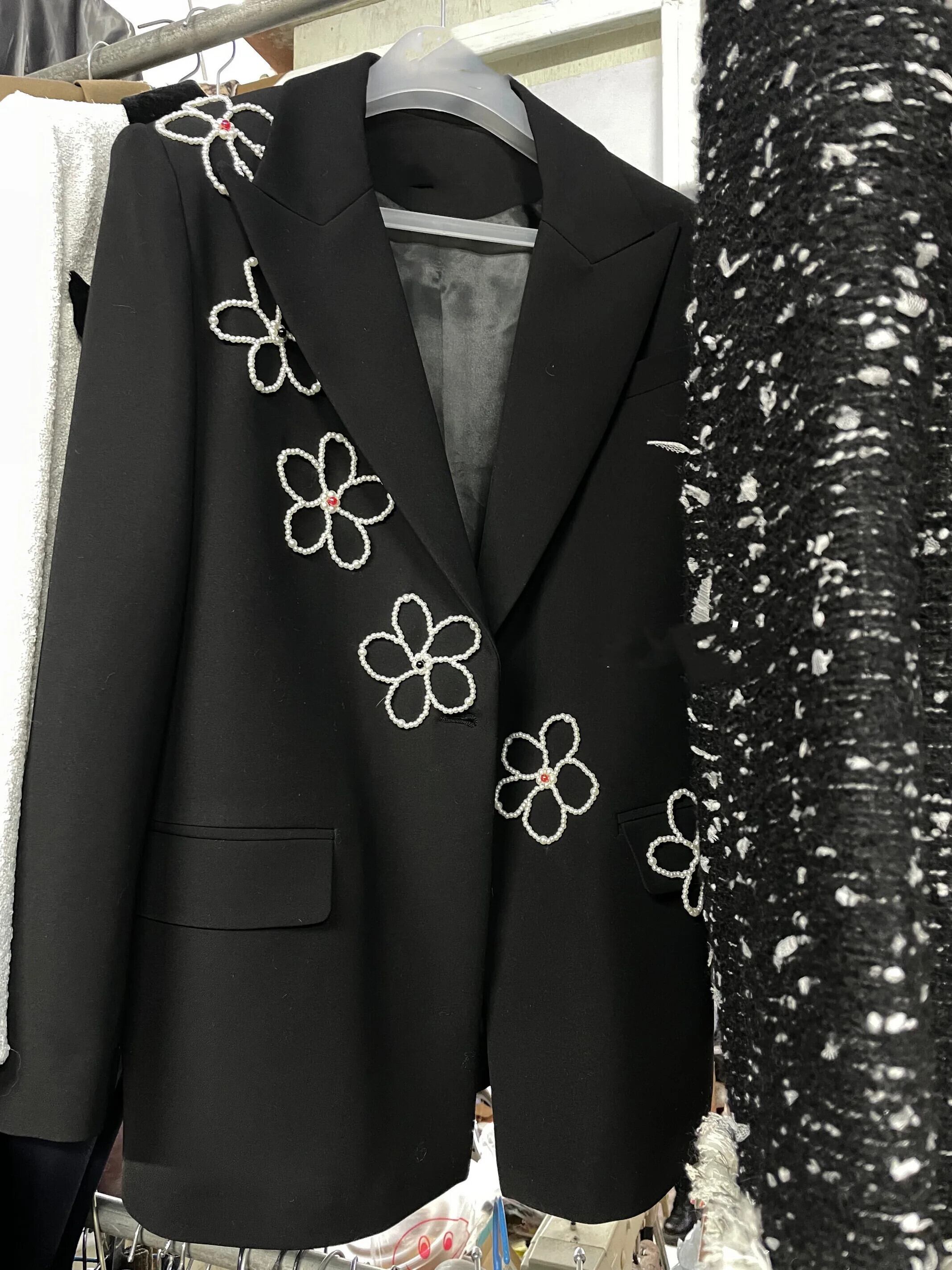Pinkoz デザイナーファッションスタイリッシュ黒花ビーズノッチネックルーズジャケットエレガントブレザーヴィンテージローブ ピンク ブラック フラワーデザイン ビンテージ