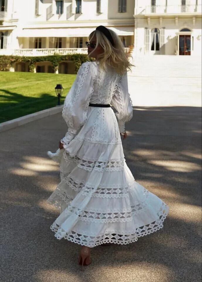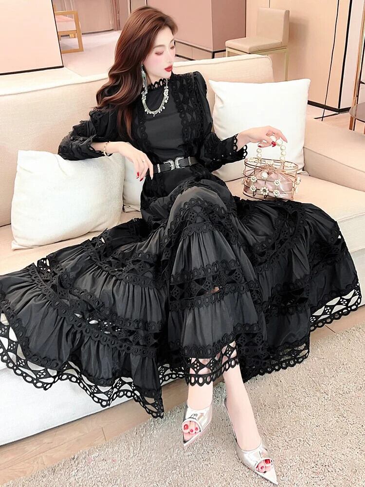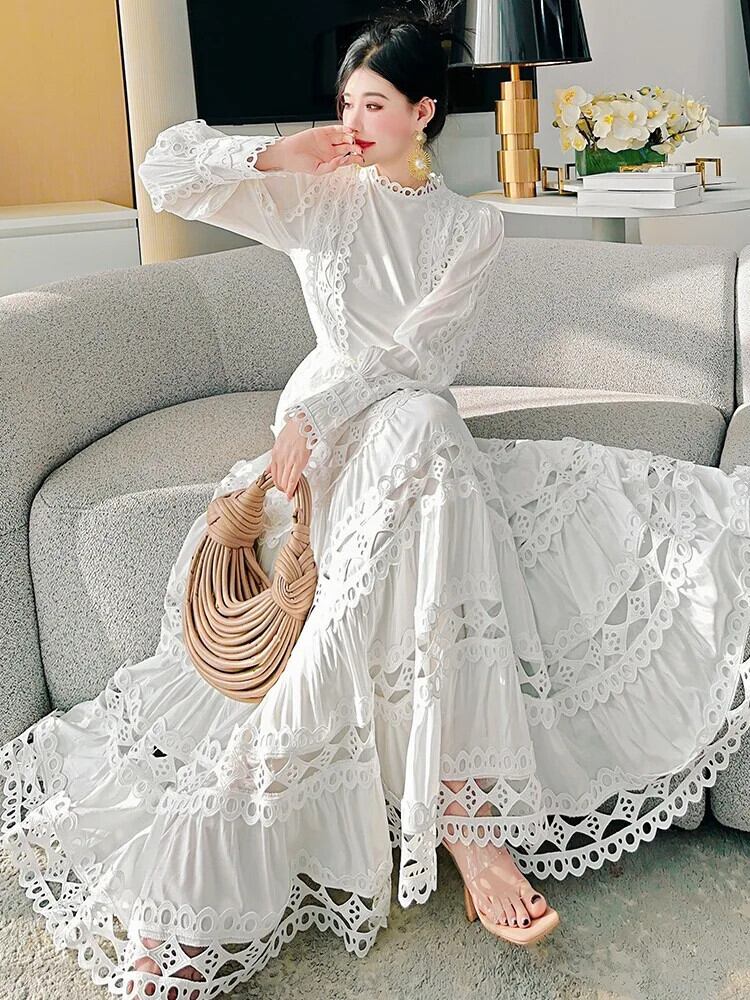 Pinkoz 滑走路デザイナー o ネック長袖マキシドレスパッチワークレースアウトレース高級パーティー Vestidos ドレスヴィンテージ ロング ピンク Oネック ビンテージ